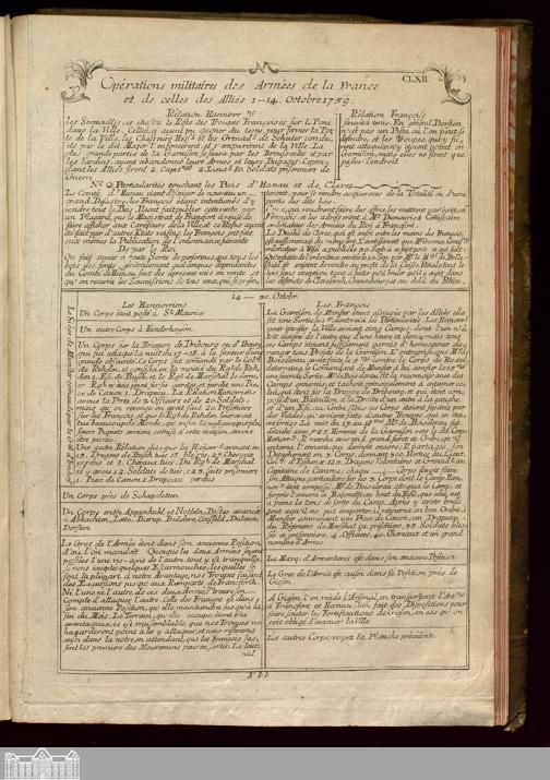 Renfermant tous les événemens militaires et politiques, avec le precis des actes publics y relatifs, et representant particulierement par des tables chronologiques ... depuis le commencement de la guerre jusqu'à la fin de l'année 1758