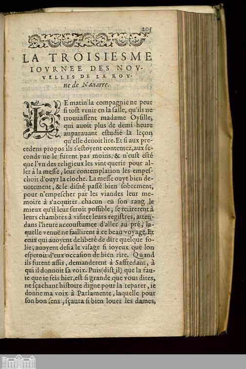 La Troisiesme Iovrnee Des Novelles De La Royne de Nauarre.