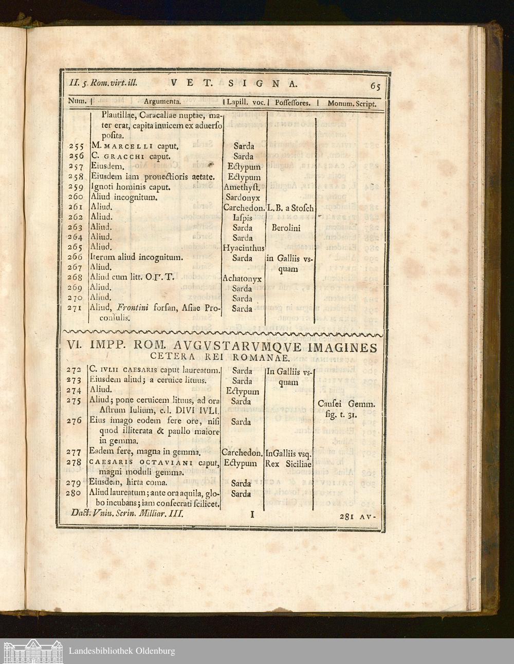 Dactyliothecae Vniversalis Scrinii Milliarii III. Pars Altera Fere Historicae Sectio Secvnda. V. Primordia Vrbis Romae Et Rom. Virt. Ill.