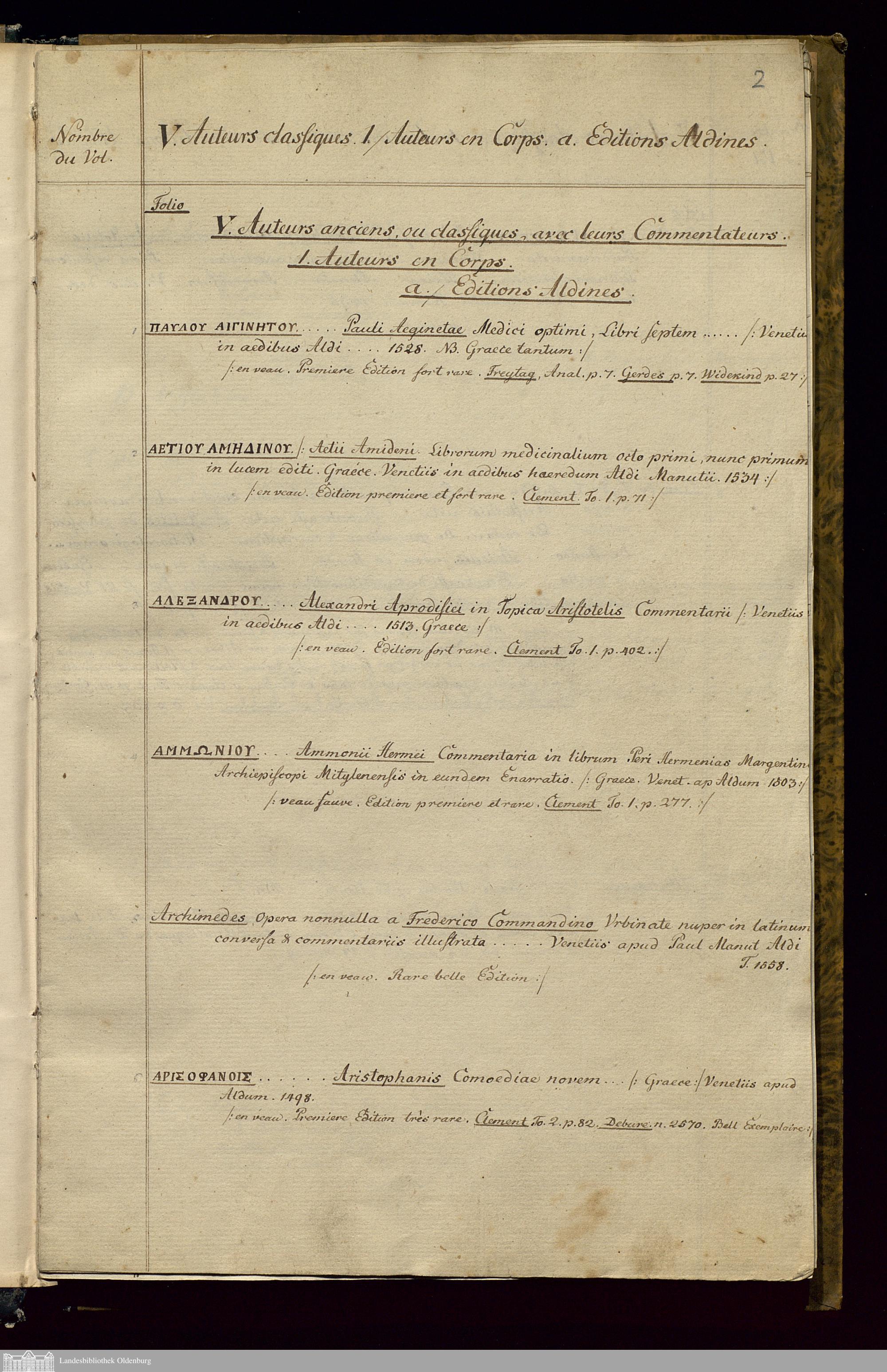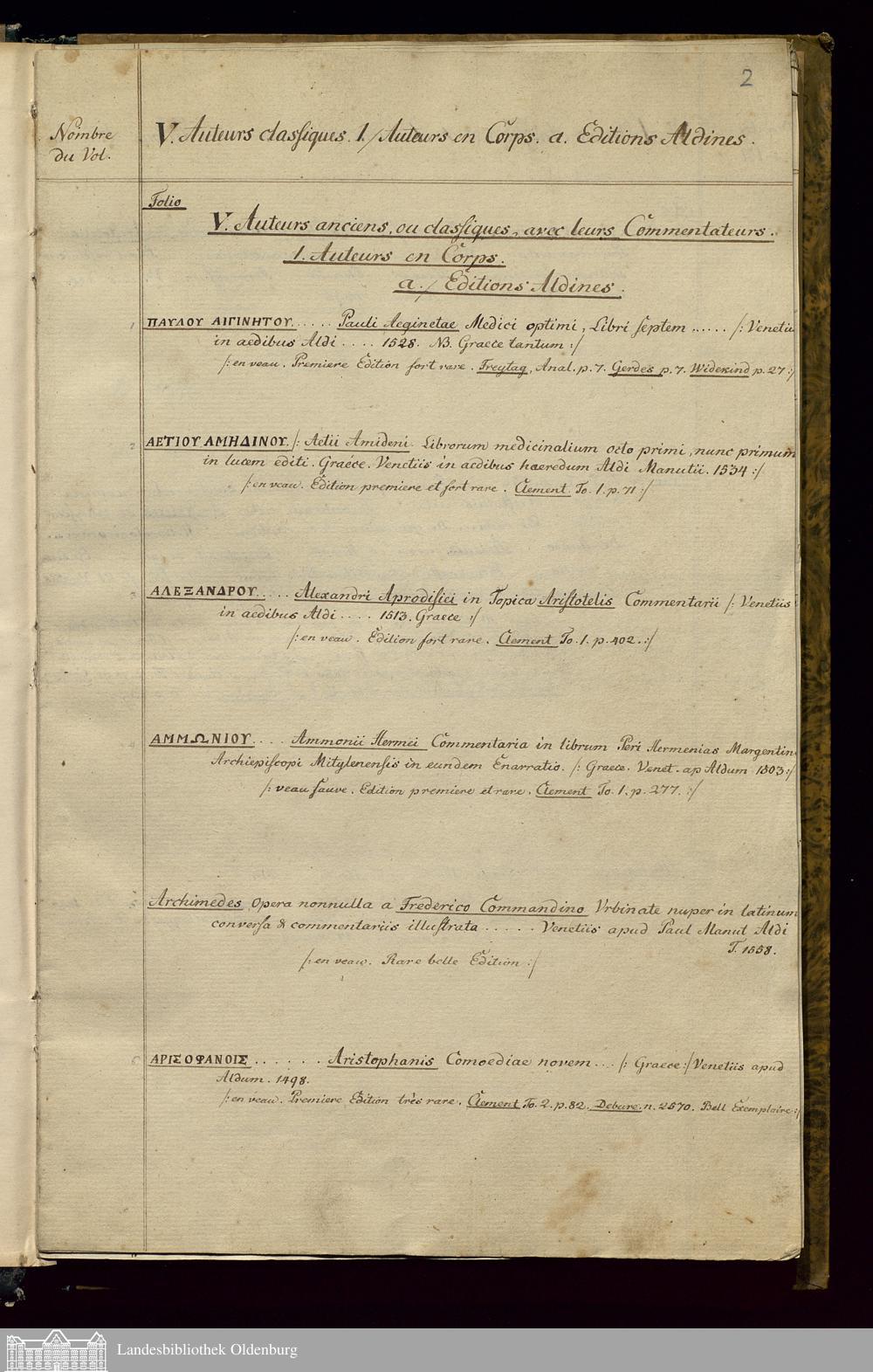 V. Auteurs anciens, ou classiques, avec leurs Commentateurs. [Alte klassische Autoren und ihre Kommentatoren]