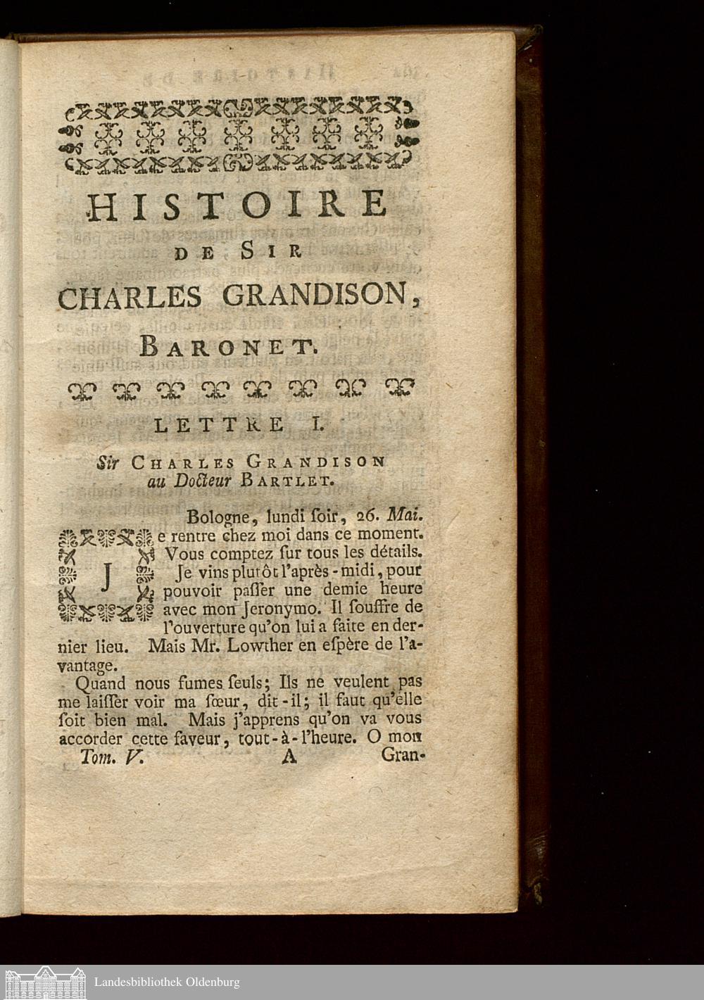 Lettre I. Sir Charles Grandison au Docteur Bartlet.