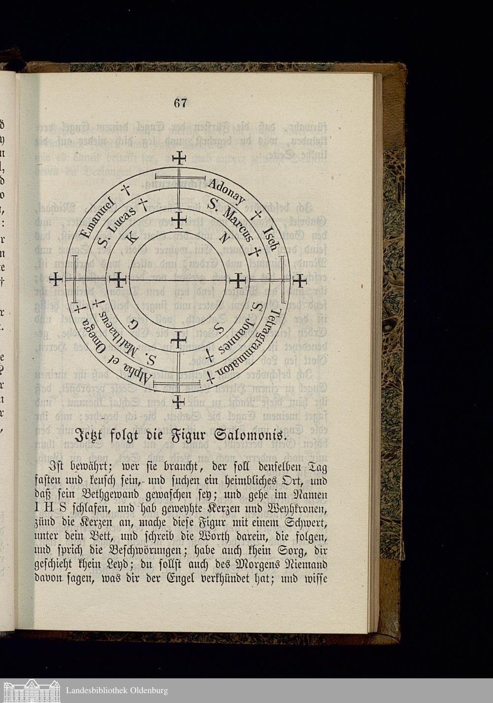 Nigromantisches Kunst-Buch, handelnd von der Glücks-Ruthe, dem Ring und der Krone Salomonis, den Fürsten-Geheimnissen, den dienstbaren Krystall- und Schatz-Geistern und andern wunderbaren Arcanen : Nach einer Handschrift aus der Bibliothek eines Fürst-Abtes im vorigen Jahrhundert wortgetreu und mit allen Abbildungen veröffentlicht : Der wahrhaftige englische Schlüssel Salomonis ... / Nach dem wahren Original verdeutscht und mit Abbildungen