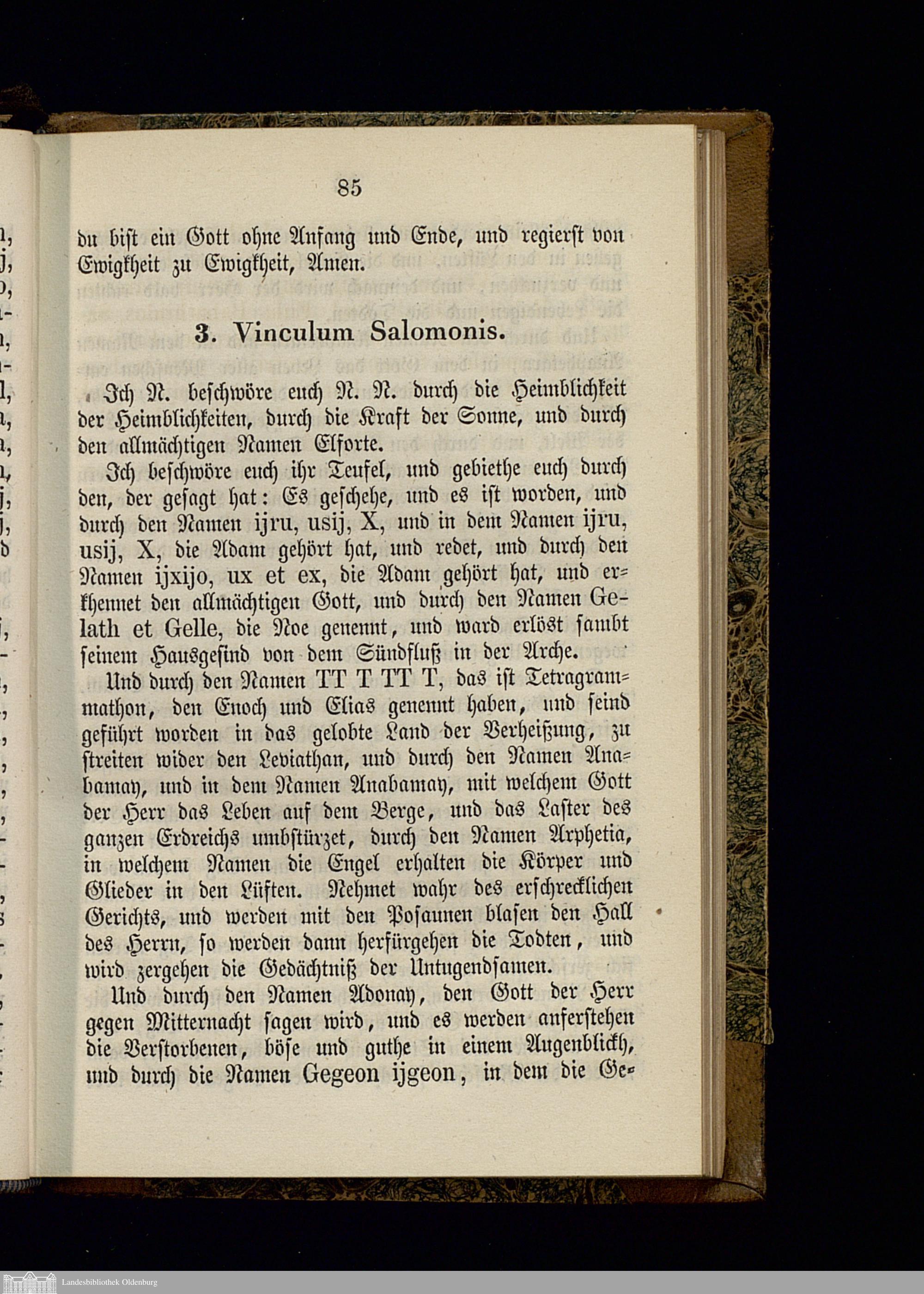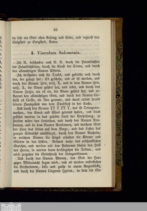 Nigromantisches Kunst-Buch, handelnd von der Glücks-Ruthe, dem Ring und der Krone Salomonis, den Fürsten-Geheimnissen, den dienstbaren Krystall- und Schatz-Geistern und andern wunderbaren Arcanen : Nach einer Handschrift aus der Bibliothek eines Fürst-Abtes im vorigen Jahrhundert wortgetreu und mit allen Abbildungen veröffentlicht : Der wahrhaftige englische Schlüssel Salomonis ... / Nach dem wahren Original verdeutscht und mit Abbildungen