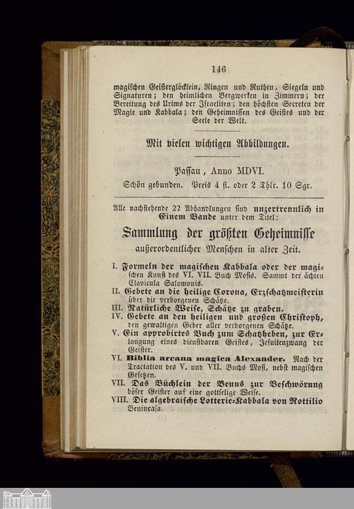 Nigromantisches Kunst-Buch, handelnd von der Glücks-Ruthe, dem Ring und der Krone Salomonis, den Fürsten-Geheimnissen, den dienstbaren Krystall- und Schatz-Geistern und andern wunderbaren Arcanen : Nach einer Handschrift aus der Bibliothek eines Fürst-Abtes im vorigen Jahrhundert wortgetreu und mit allen Abbildungen veröffentlicht : Der wahrhaftige englische Schlüssel Salomonis ... / Nach dem wahren Original verdeutscht und mit Abbildungen