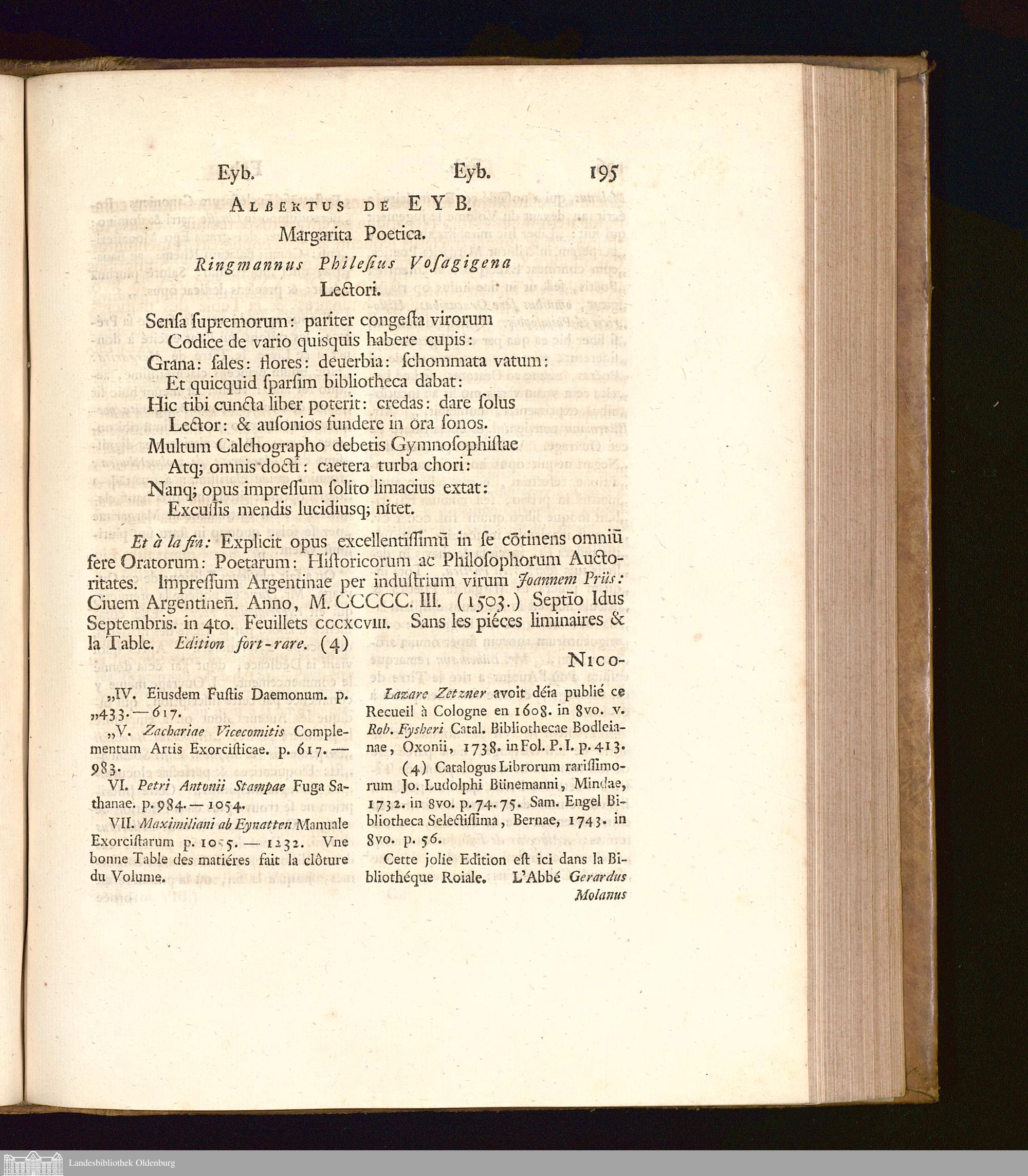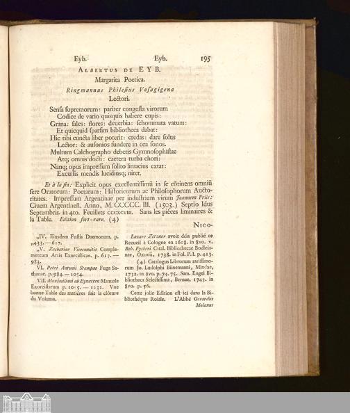 Albertus De Eyb. Margarita Poetica. Ringmanus Philesius Vosagigena Lectori.