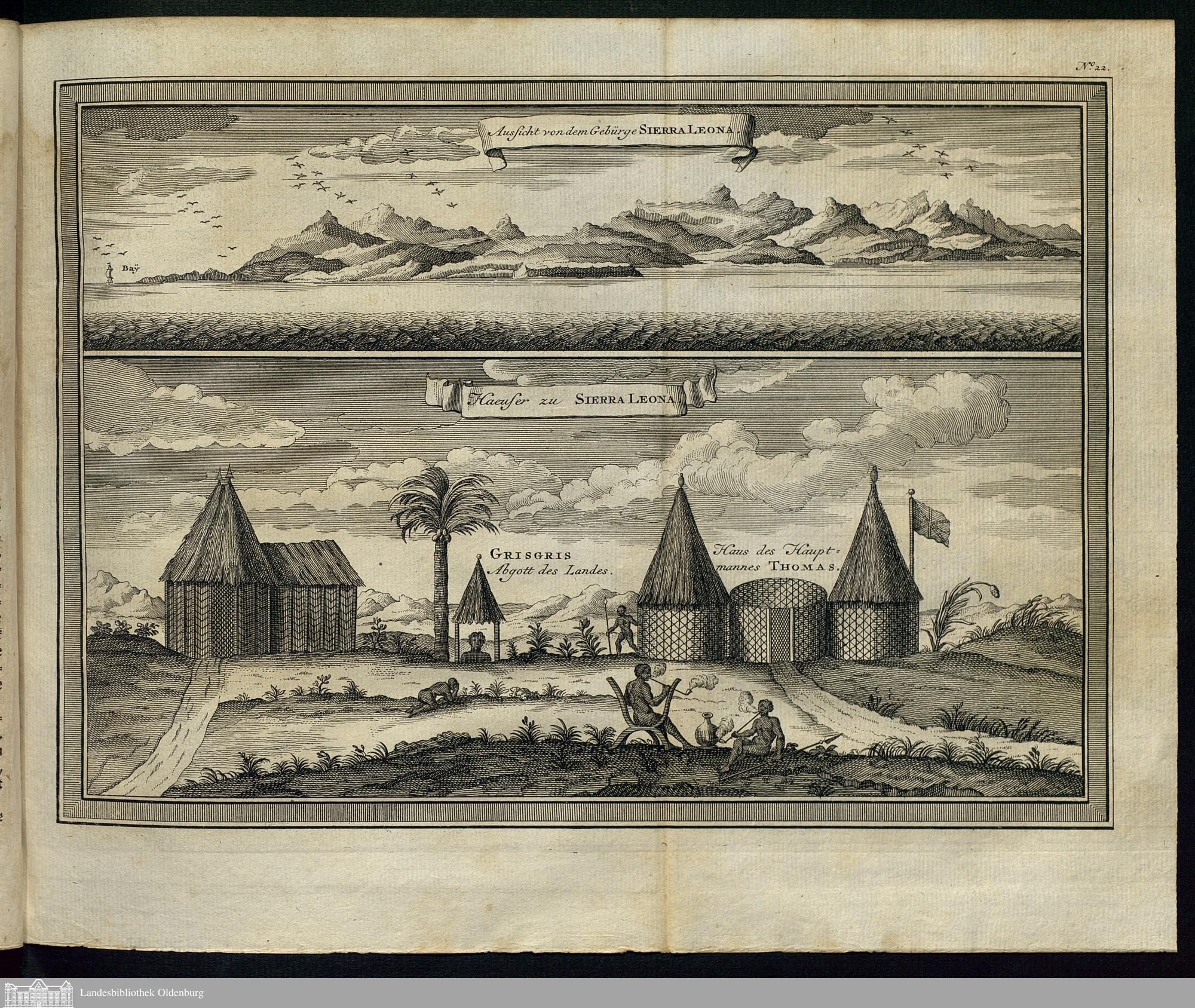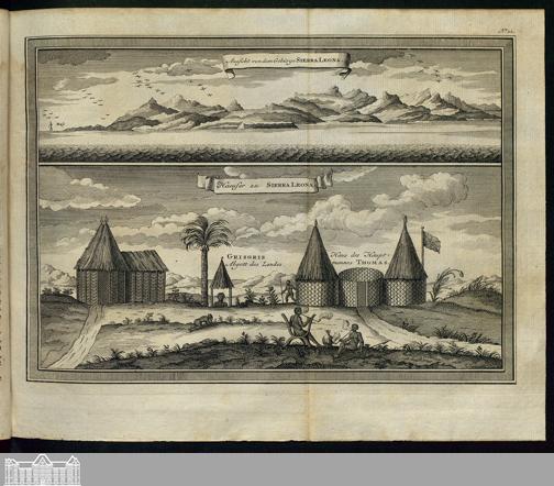 Illustration: Aussicht von dem Gebürge Sierra Leona; Haeuser zu Sierra Leona.