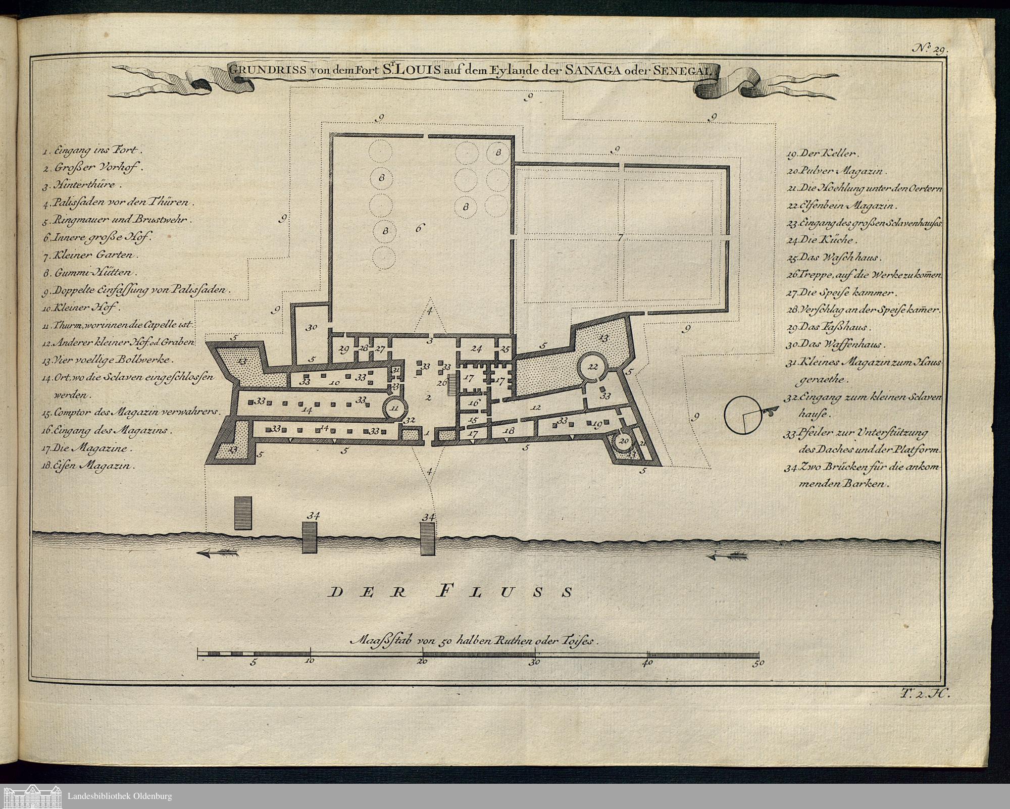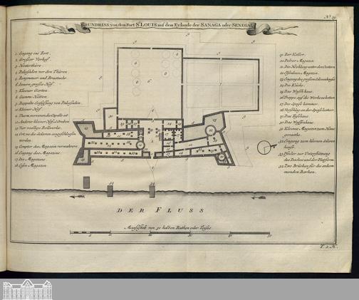 Illustration: Grundriss von dem Fort St. Louis auf dem Eylande der Sanaga oder S...