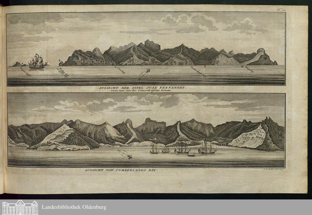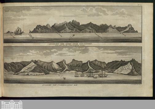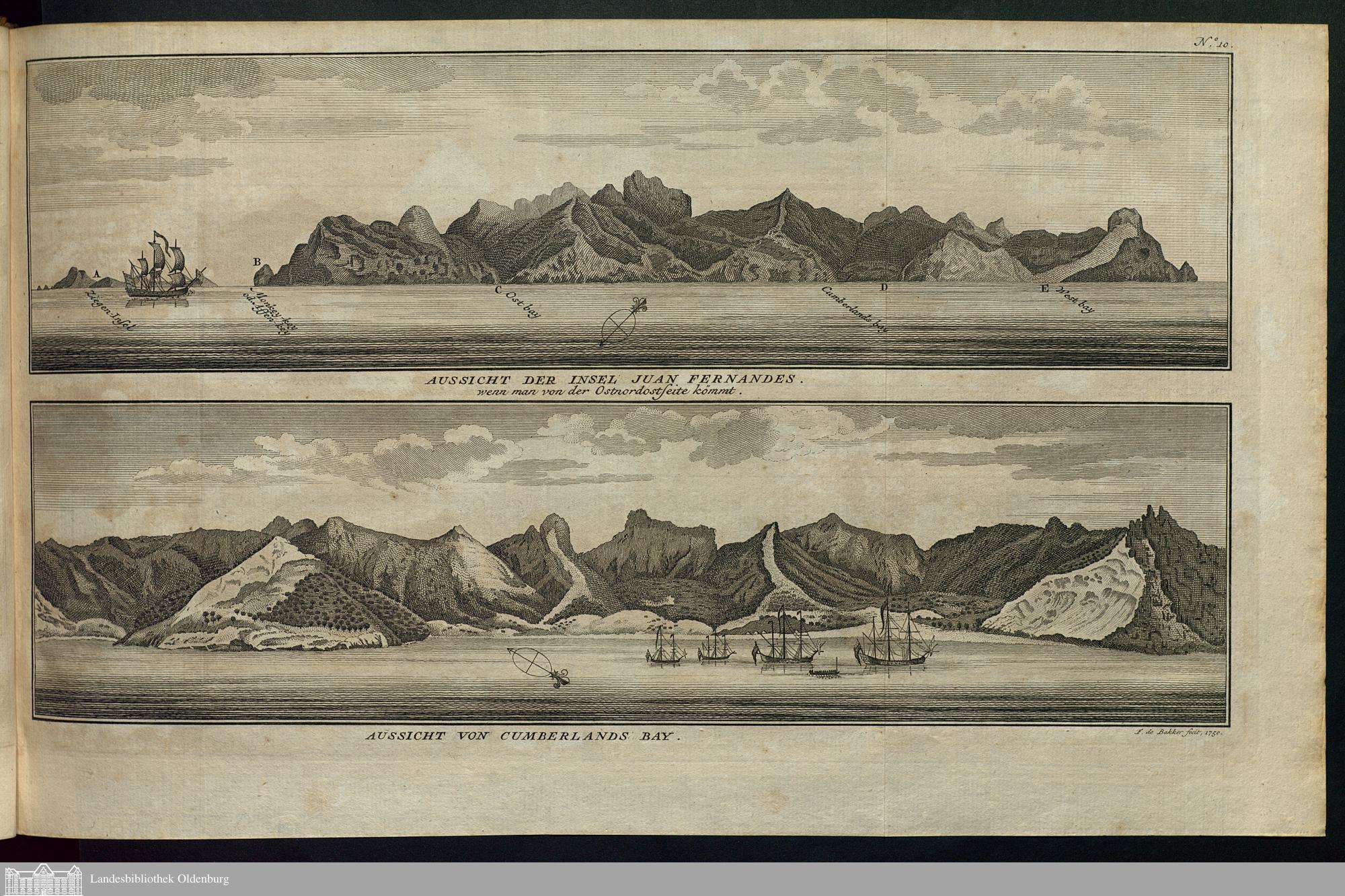 Illustration: Aussicht der Insel Juan Fernandes; Aussicht von Cumberlands Bay.