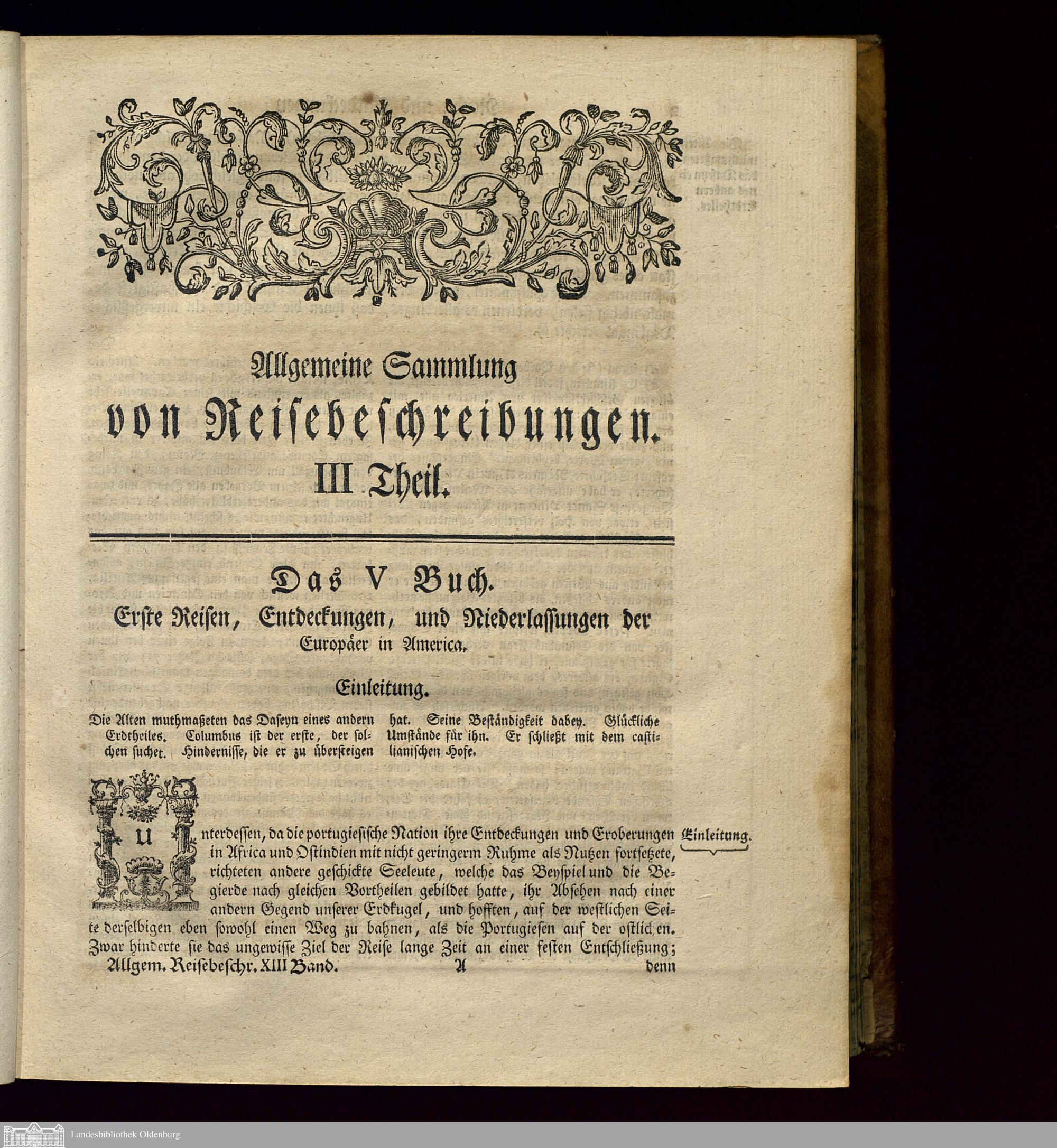 Allgemeine Sammlung von Reisebeschreibungen. III Theil. Das V Buch. Erste Reisen,...