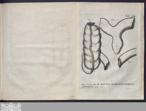 Illustration: Tab. XVIII. Disp. Chirurg. Tom. III. Heister De Hernia Incarcerata...