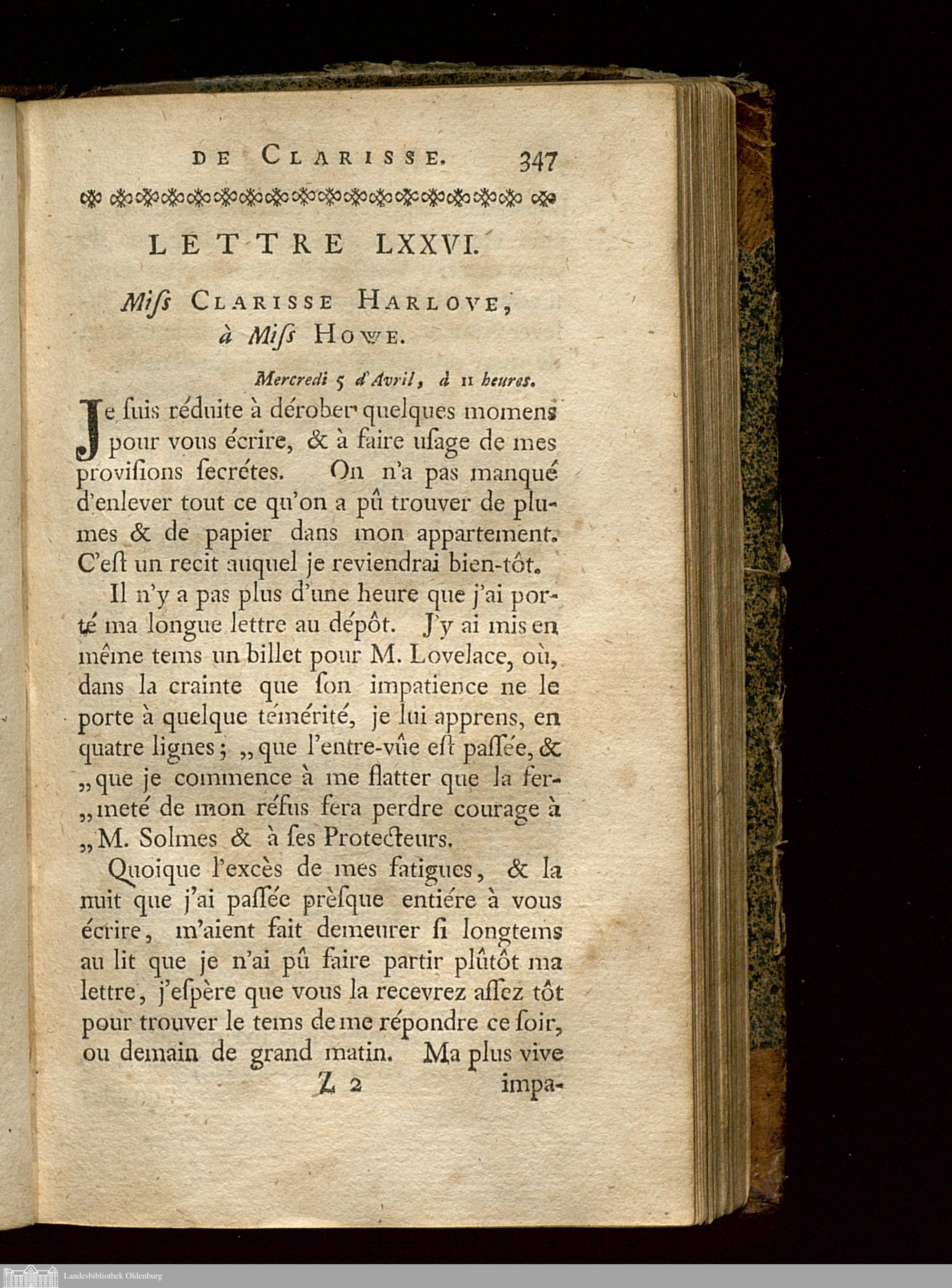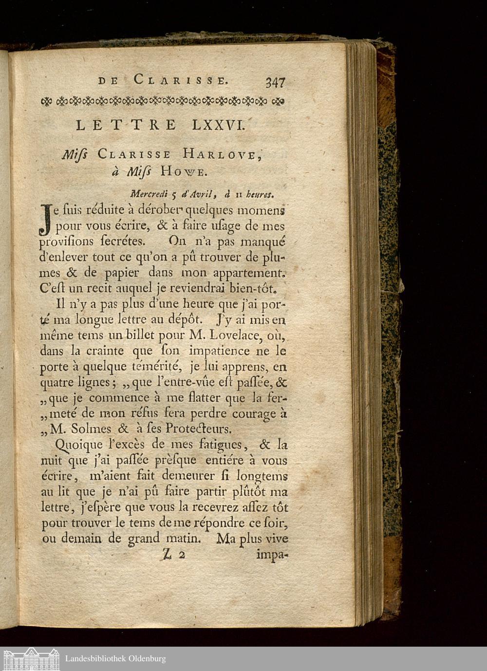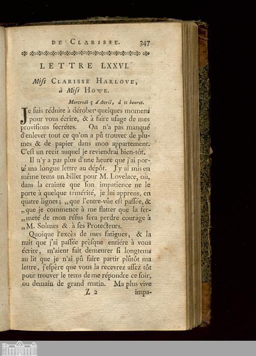 Lettre LXXVI. Miss Clarisse Harlove, à Miss Howe.