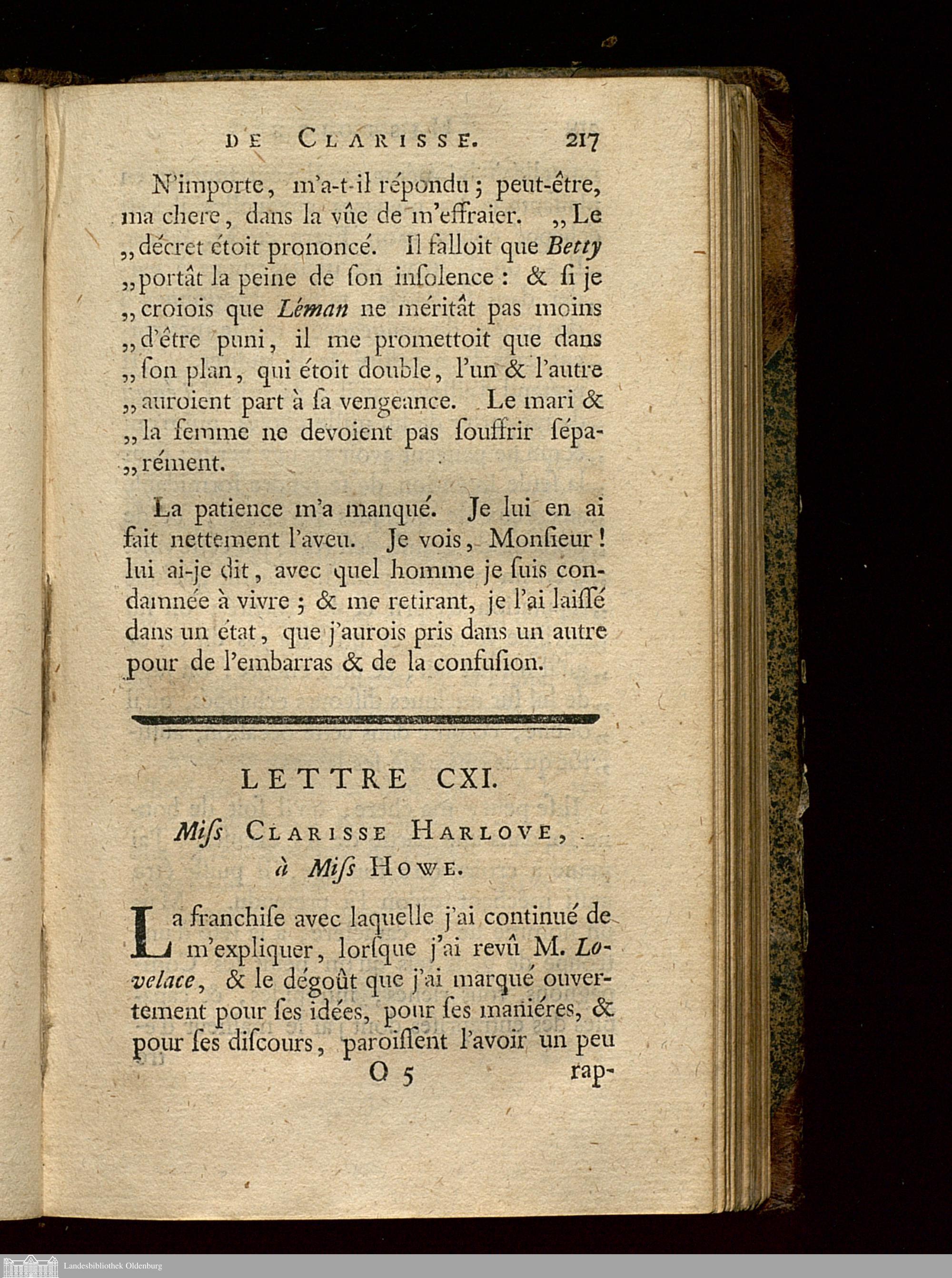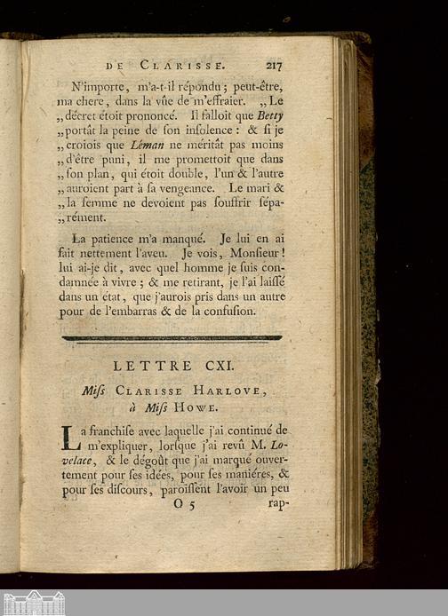 Lettre CXI. Miss Clarisse Harlove, à Miss Howe.