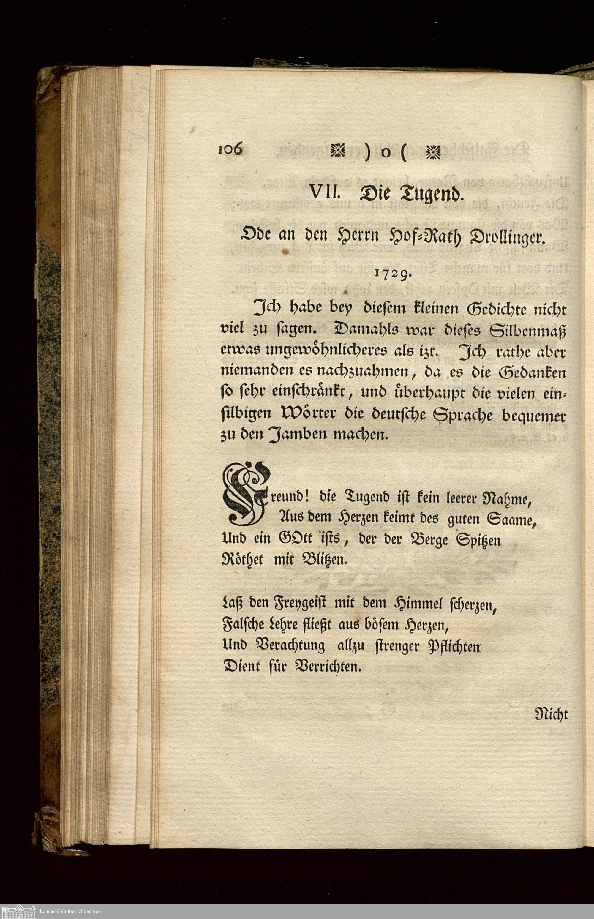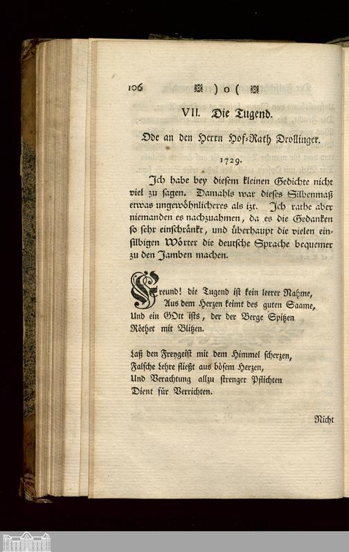 VII. Die Tugend. Ode an den Herrn Hor-Rath Drollinger.