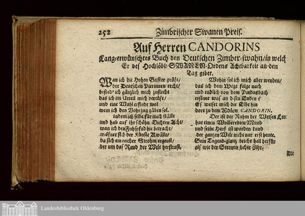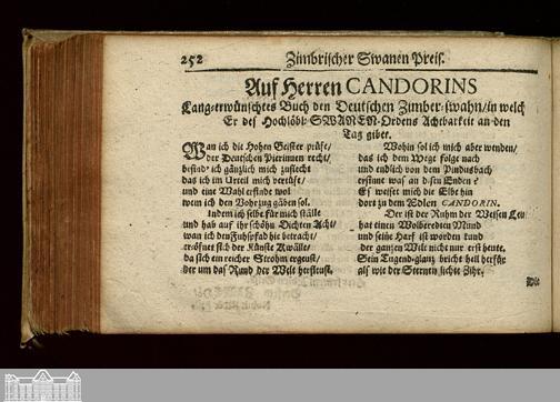 Candorins Deutscher Zimber Swan : Darin Des Hochlöbl. ädelen Swan-Ordens Anfang, Zunamen, Bewandnis, Gebräuche, Satsungen, Ordensgesätse, samt der Hochansähel. Geselschafter Ordens-Namen entworfen