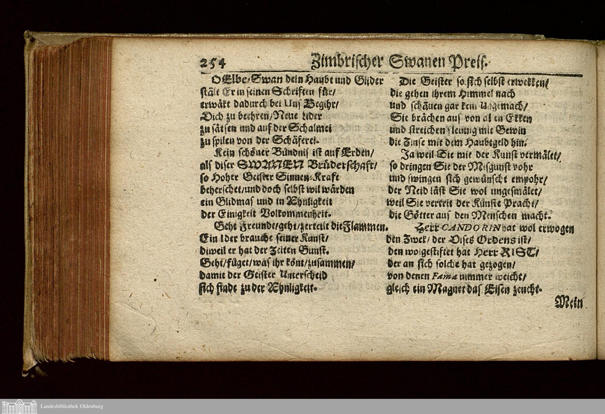 Candorins Deutscher Zimber Swan : Darin Des Hochlöbl. ädelen Swan-Ordens Anfang, Zunamen, Bewandnis, Gebräuche, Satsungen, Ordensgesätse, samt der Hochansähel. Geselschafter Ordens-Namen entworfen