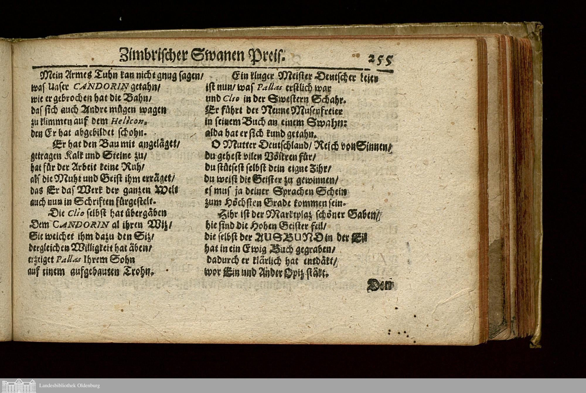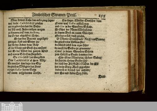 Candorins Deutscher Zimber Swan : Darin Des Hochlöbl. ädelen Swan-Ordens Anfang, Zunamen, Bewandnis, Gebräuche, Satsungen, Ordensgesätse, samt der Hochansähel. Geselschafter Ordens-Namen entworfen