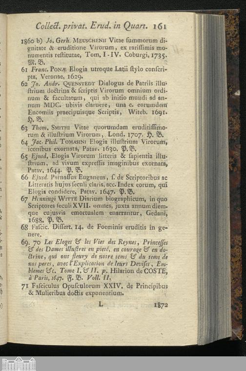 Catalogus Bibliothecae Ern. Gotthelf Beckeri, Sereniss. Principis Electoris Saxon. A Consiliis Aulicis Et In Concilio Sanctiori Referendarii, Auctione Publica, Parata Pecunia Vendendae : Dresdae, In Aedibus Schmiederianis, In Platea, vulgo große Frauengasse, d. 1. Novembr. & seqq. 1774. Horis A Tertia Pomeridianis Electorali Auctionatore Georg. Paul Walthero. ...