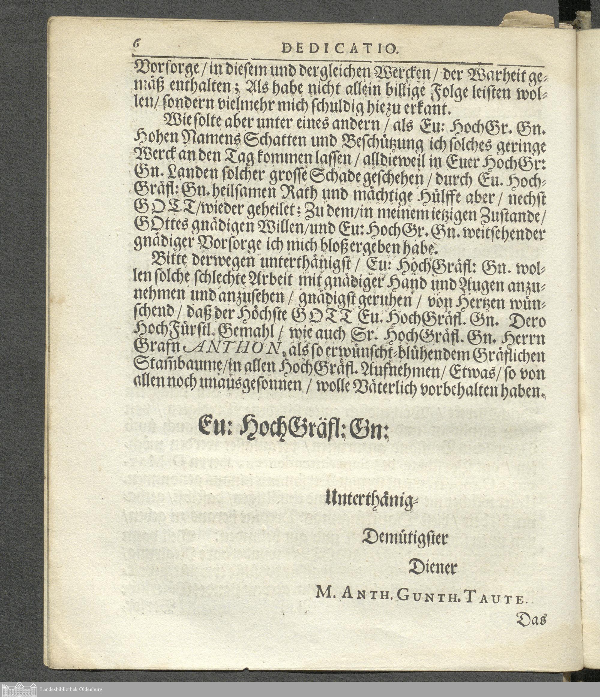 Mirabilia Dei Per Aquas: Das ist, Des grossen Gottes Wunder-Macht. Wie sich solche Durch des Wassers Gewalt und dessen Bezwingung unter den Menschen Kindern erweiset : Aus dem 5. und 6. vers. des 66. Psalm Davids, Bey der Brake, Welche zur Keeseburg an der Weser, der Voigtey Hammelwarden, in der der Grafschafft Oldenburg, Anno 1663. am 9. Octobr. von grausamen Sturm und grossen Wasser Fluthen eingerissen... in einer Dancksagungs-Predigt ... Abgebildet und herausgegeben / Von M. Anthon Gunther Tauten, Oldenburg