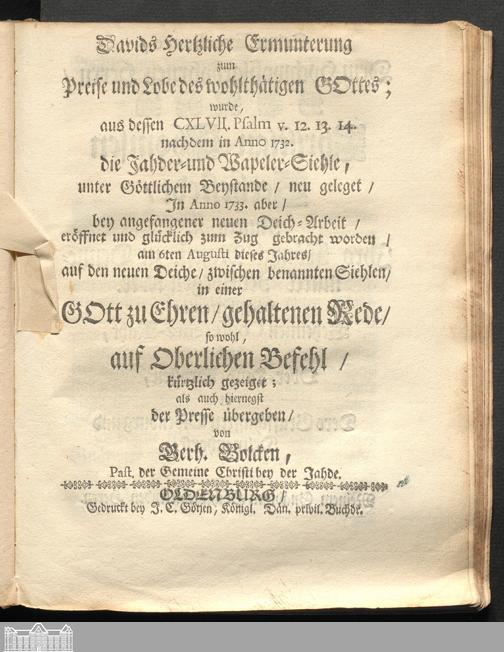 Davids Hertzliche Ermunterung zum Preise und Lobe des wohlthätigen Gottes : wurde, aus dessen CXLVII. Psalm v. 13. 14. 15. nachdem in Anno 1732. die Jahder- und Wapeler-Siehle, ... neu geleget, aber, bey angefangener neuen Deich-Arbeit, ... in einer gehaltenen Rede ... / von Gerh. Bolcken, Past. der Gemeine Christi bey der Jahde