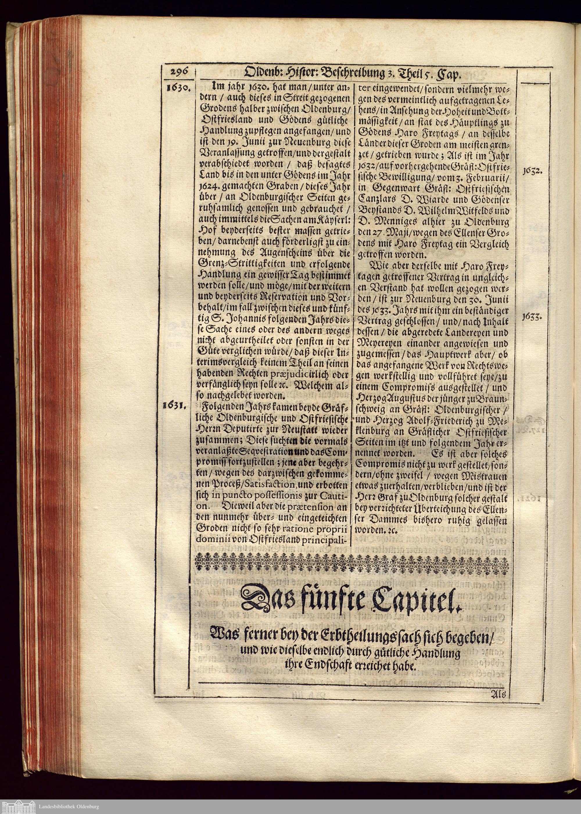 Oldenburgische Friedens- und der benachbarten Oerter Kriegs-Handlungen : Darinn Des ... Anthon Günthers/ Grafens zu Oldenburg und Delmenhorst/ ... Uralte hohe Ankunft/ ... fürsichtige ... Regirung ... und hochseliger Abschied: Wie auch Eine warhafte Beschreibung Der Grafschaften Oldenburg und Delmenhorst/ Herrschaften Jhever und Kniphausen/ Statt-Buttjhadinger- und WürderLanden [et]c. sambt ... wichtigen ... Historischen und Politischen Sachen/ so sich vom Jahr 1603. wie auch vorhero/ bis auf das Jahr 1667. begeben / Aus ... Original-Archivalischen Acten ... zusammen getragen/ und ... in Fünf Theile verabfasset/ Mit schönen kunstreichen Kupferstücken/ und ... Conterfaiten ausgezieret ... Von Johann-Just Winkelmann/ HochFürstl: Hessischen/ auch vormaligen HochGräfl: Oldenburgischen Rath und Historiographo