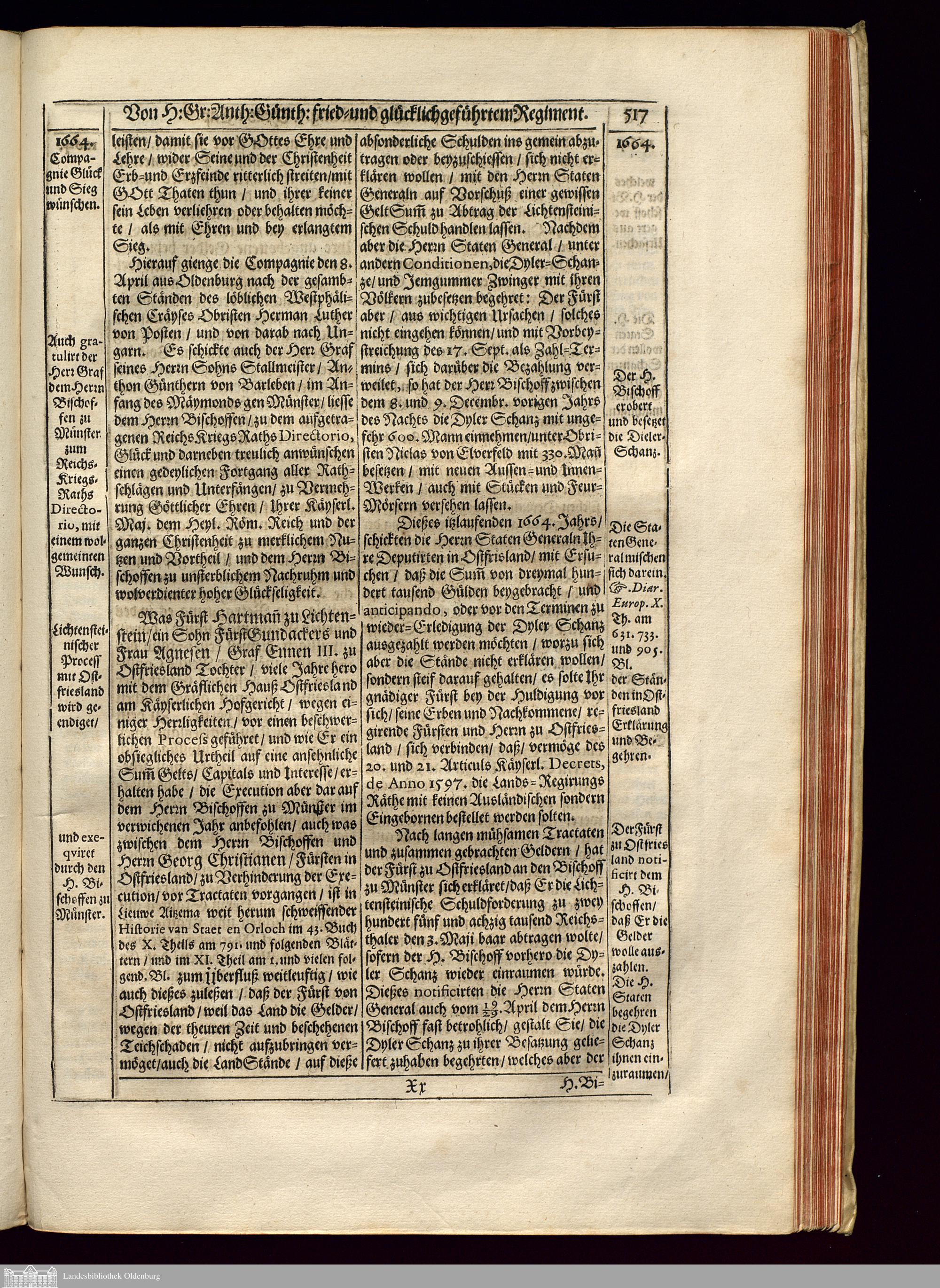 Oldenburgische Friedens- und der benachbarten Oerter Kriegs-Handlungen : Darinn Des ... Anthon Günthers/ Grafens zu Oldenburg und Delmenhorst/ ... Uralte hohe Ankunft/ ... fürsichtige ... Regirung ... und hochseliger Abschied: Wie auch Eine warhafte Beschreibung Der Grafschaften Oldenburg und Delmenhorst/ Herrschaften Jhever und Kniphausen/ Statt-Buttjhadinger- und WürderLanden [et]c. sambt ... wichtigen ... Historischen und Politischen Sachen/ so sich vom Jahr 1603. wie auch vorhero/ bis auf das Jahr 1667. begeben / Aus ... Original-Archivalischen Acten ... zusammen getragen/ und ... in Fünf Theile verabfasset/ Mit schönen kunstreichen Kupferstücken/ und ... Conterfaiten ausgezieret ... Von Johann-Just Winkelmann/ HochFürstl: Hessischen/ auch vormaligen HochGräfl: Oldenburgischen Rath und Historiographo