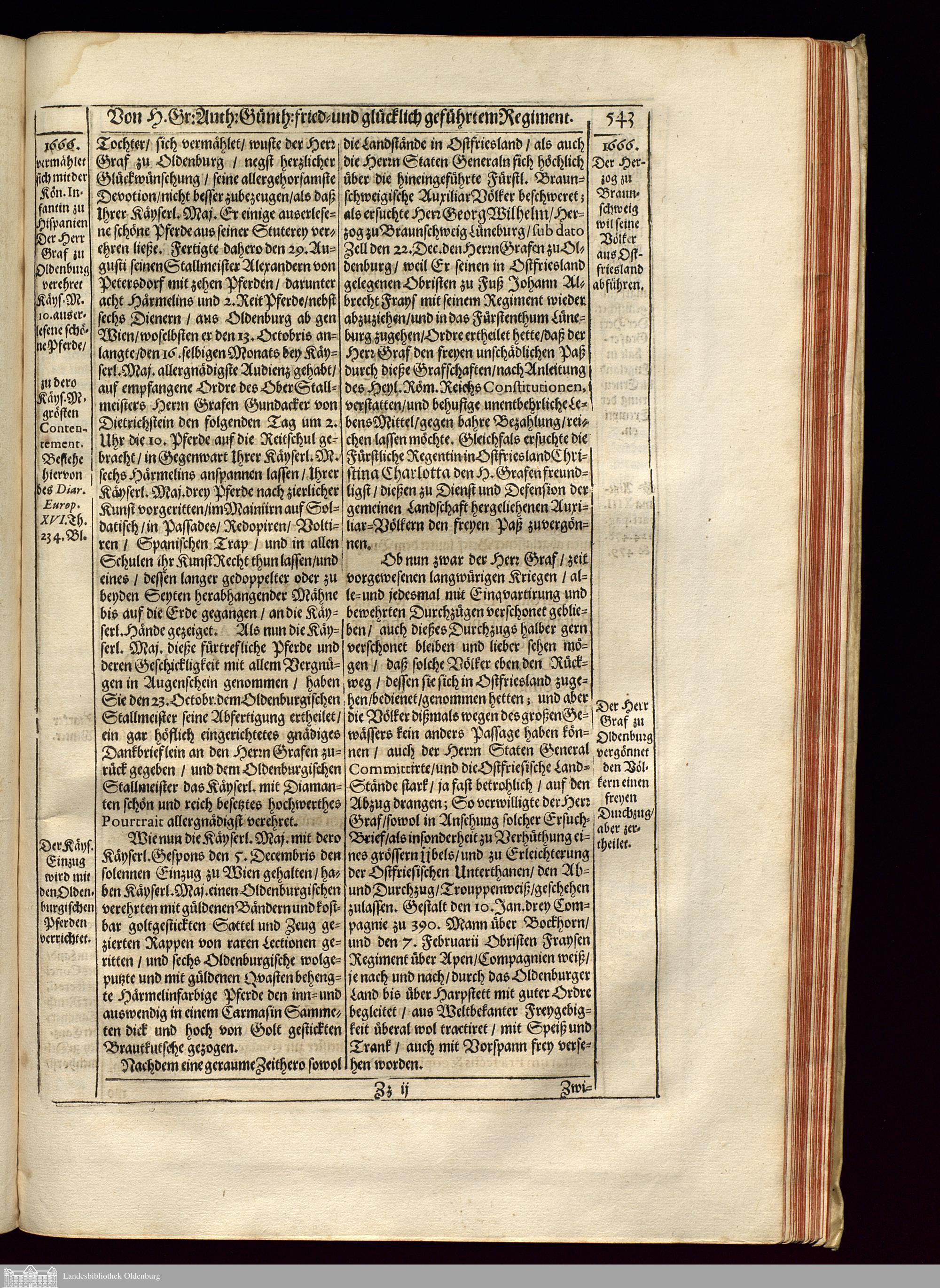 Oldenburgische Friedens- und der benachbarten Oerter Kriegs-Handlungen : Darinn Des ... Anthon Günthers/ Grafens zu Oldenburg und Delmenhorst/ ... Uralte hohe Ankunft/ ... fürsichtige ... Regirung ... und hochseliger Abschied: Wie auch Eine warhafte Beschreibung Der Grafschaften Oldenburg und Delmenhorst/ Herrschaften Jhever und Kniphausen/ Statt-Buttjhadinger- und WürderLanden [et]c. sambt ... wichtigen ... Historischen und Politischen Sachen/ so sich vom Jahr 1603. wie auch vorhero/ bis auf das Jahr 1667. begeben / Aus ... Original-Archivalischen Acten ... zusammen getragen/ und ... in Fünf Theile verabfasset/ Mit schönen kunstreichen Kupferstücken/ und ... Conterfaiten ausgezieret ... Von Johann-Just Winkelmann/ HochFürstl: Hessischen/ auch vormaligen HochGräfl: Oldenburgischen Rath und Historiographo