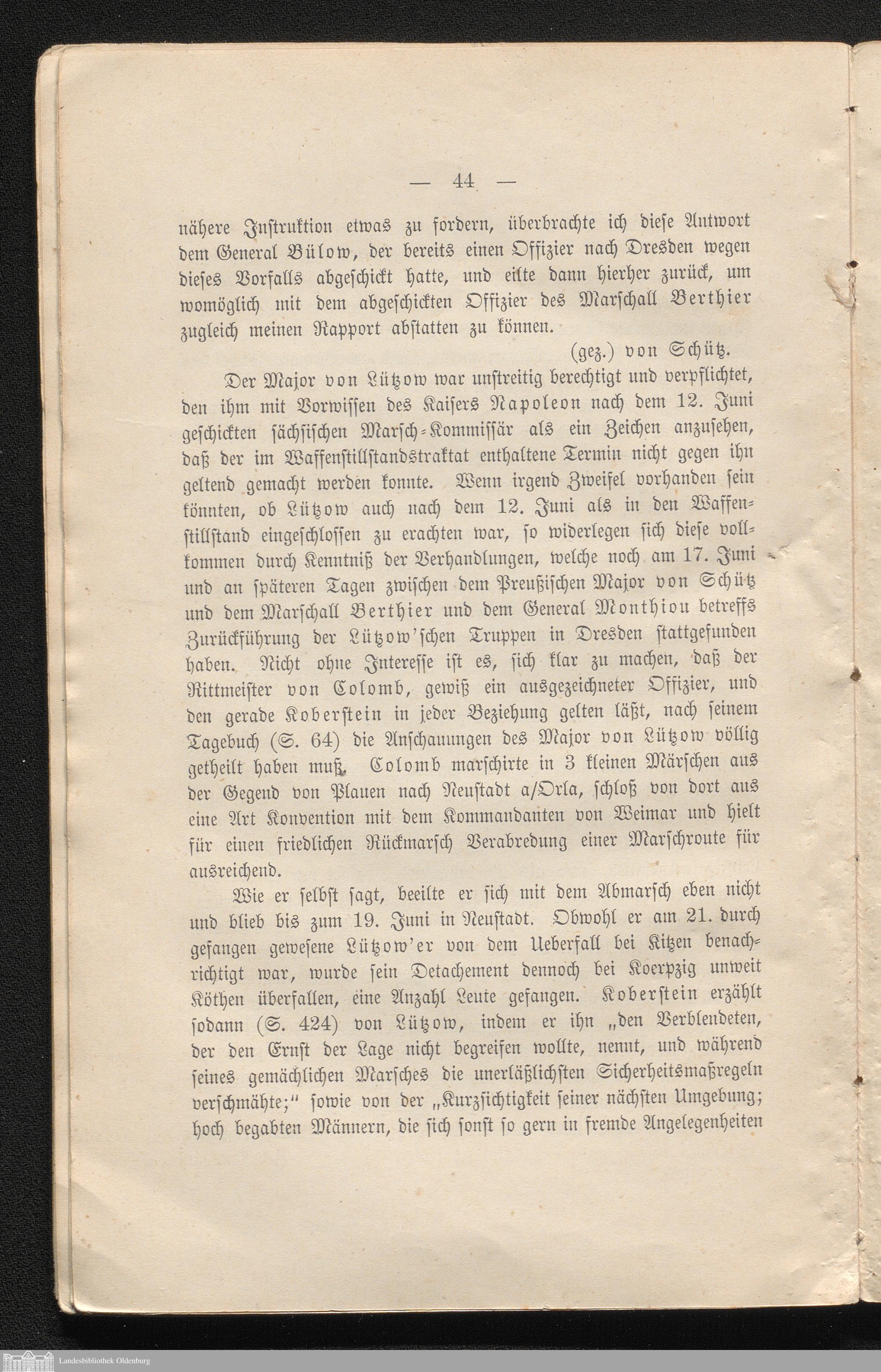 Adolf Lützow's Freikorps in den Jahren 1813 und 1814 / von A. v. L. Gegenüber der in die preußischen Jahrbücher, hrsg. von Heinrich von Treitschke, im April 1883 aufgenommene Darstellung von A. Koberstein