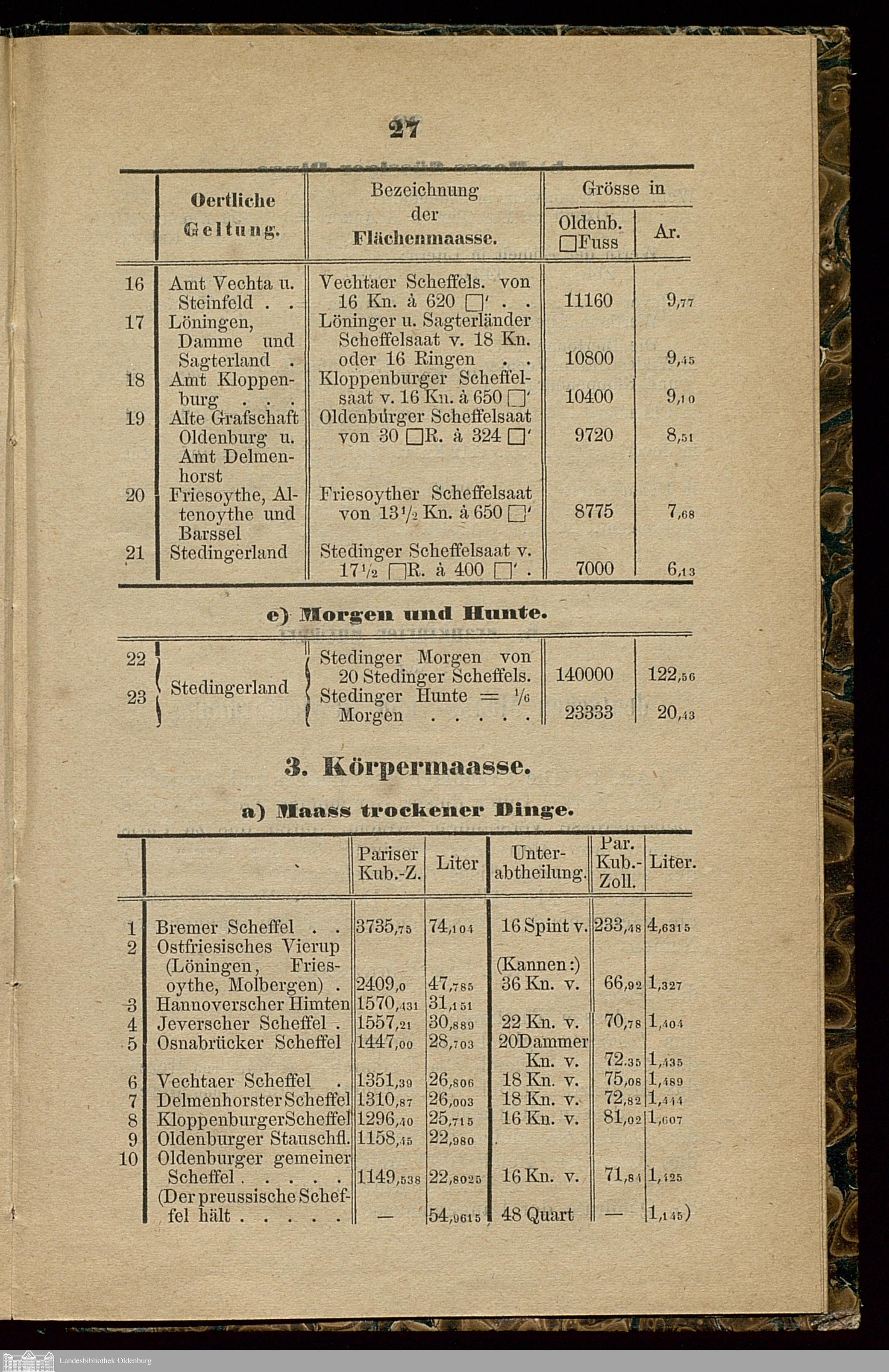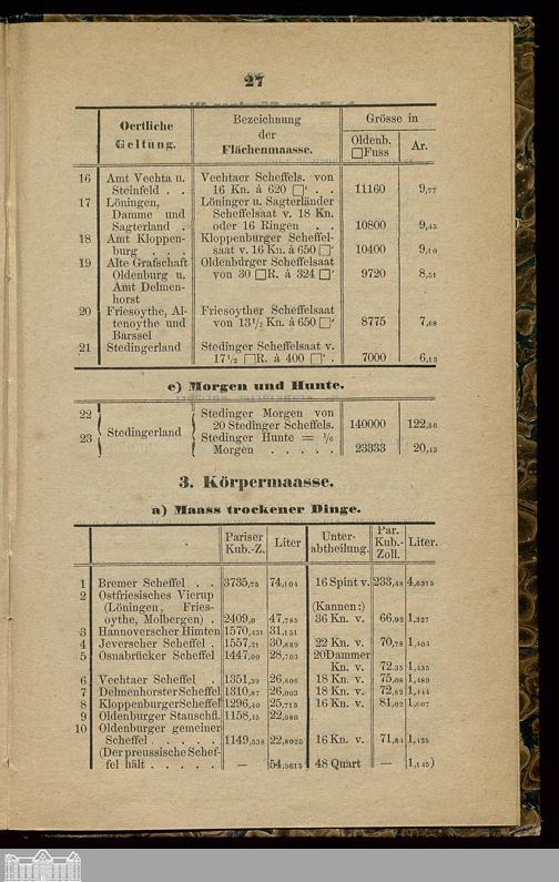 A. Vergleichstafeln der im Herzogthum Oldenburg jetzt geltenden Maassgrössen mit denen der neuen deutschen Maass- und Gewichtordnung.