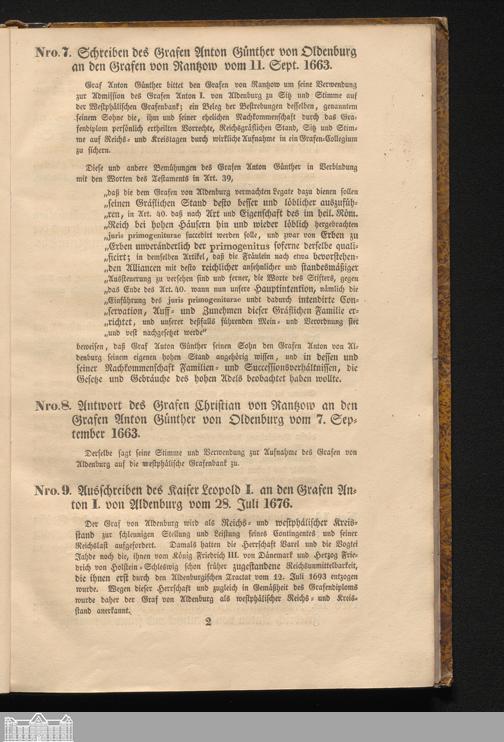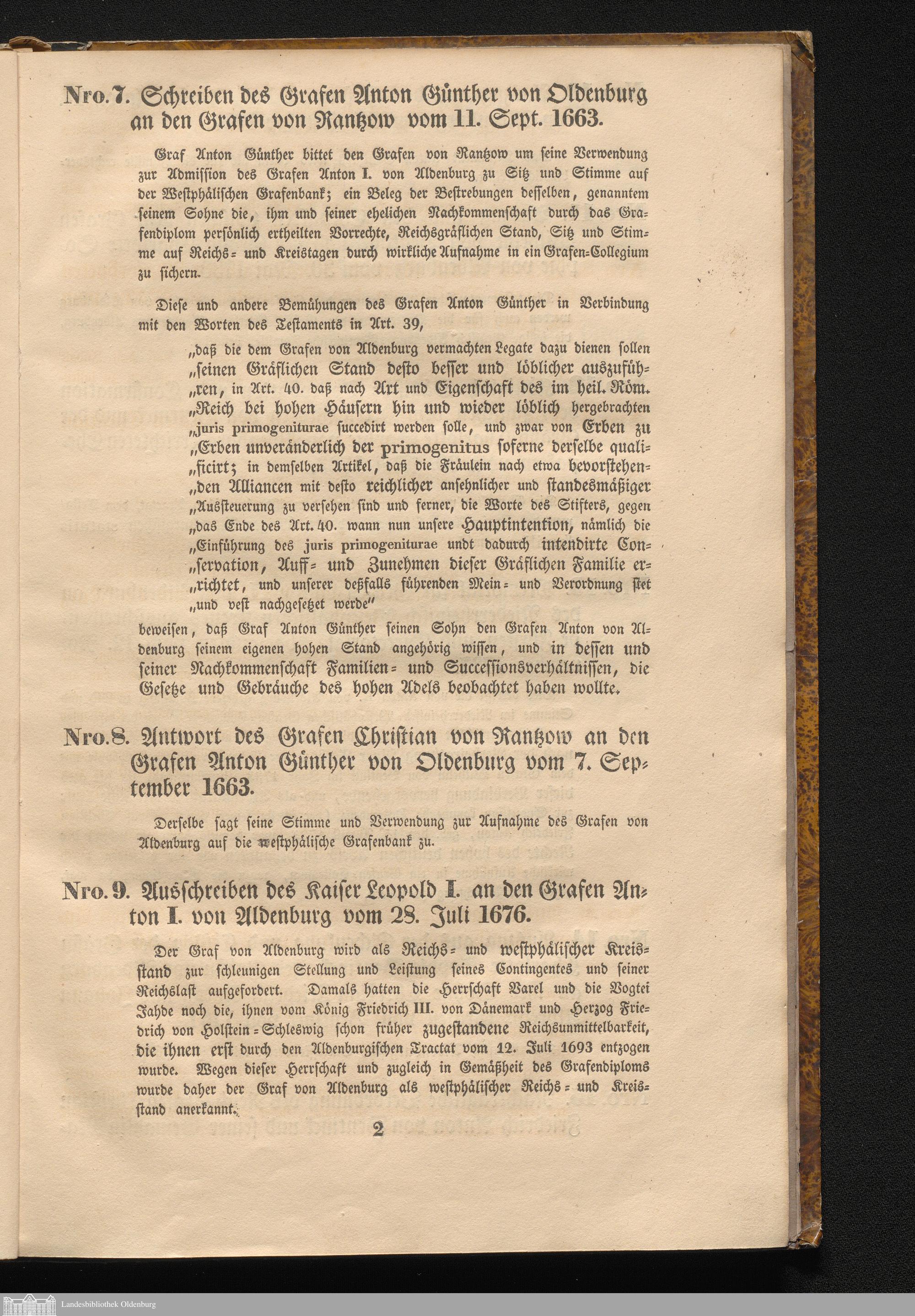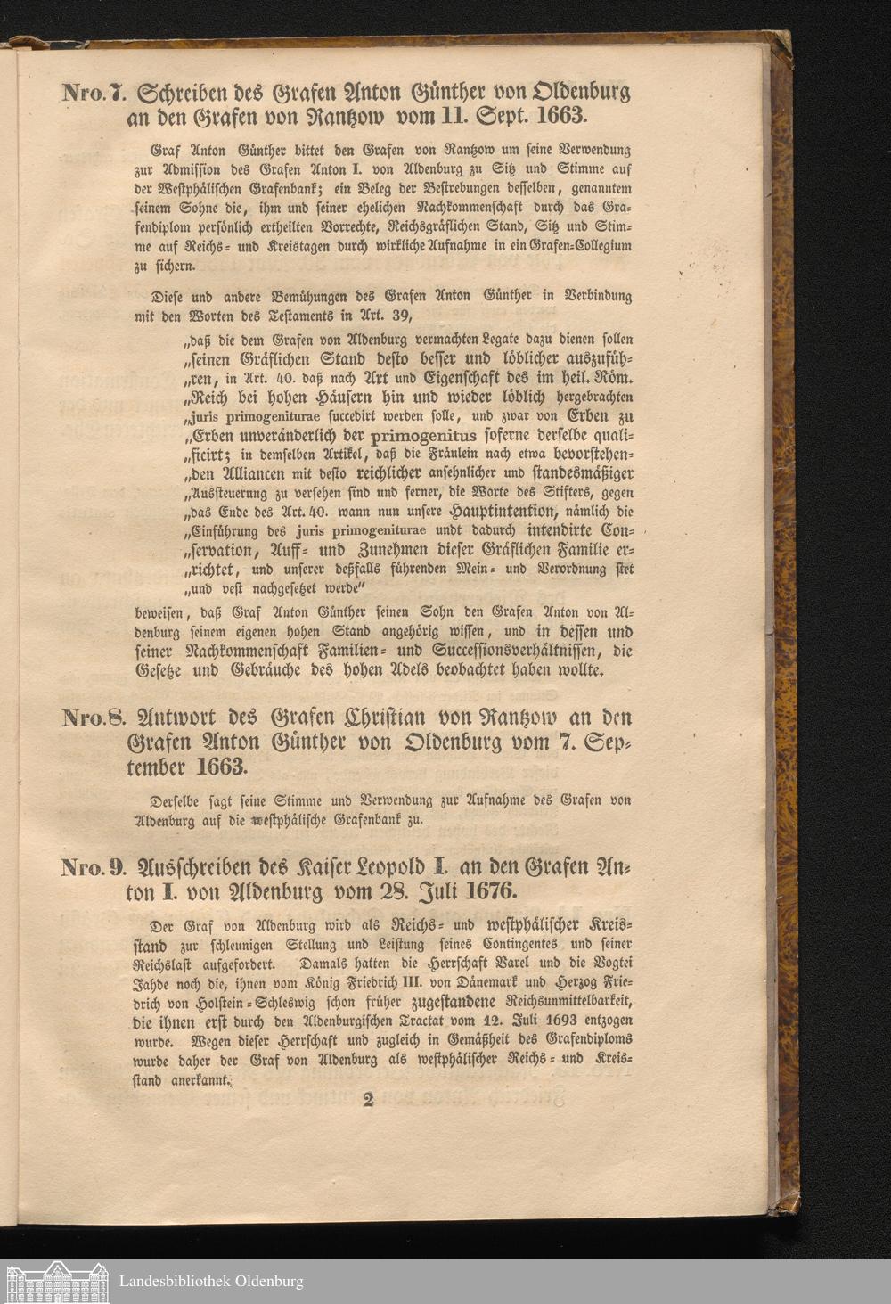 Nro. 9. Ausschreiben des Kaiser Leopold I. an den Reichs-Grafen Anton I. von Aldenburg vom 28. Juli 1676.