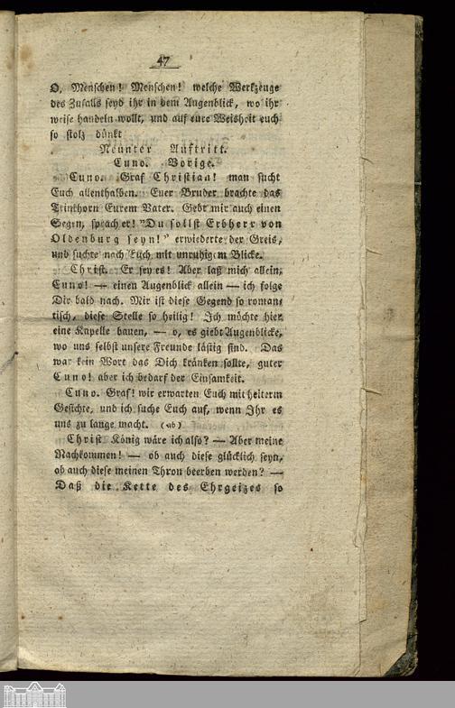 Das Königliche Stammhaus Oldenburg oder: Die Wahl Christians des Ersten : Historisch-romantisches Schauspiel mit Gesang, in zwei Aufzügen ; Zur hohen Geburtstagsfeier Sr. Majestät des Königs Christian des Siebenten und Sr. Königlichen Hoheit des Kronprinzen Friedrichs von Dännemark aufgeführt auf dem Nationaltheater zu Altona am 28sten Januar, und wiederholt am 31sten Januar, 9ten Febr. und 12ten März 1801 / von Evers. Die Musik vom Musikdirektor Hiller