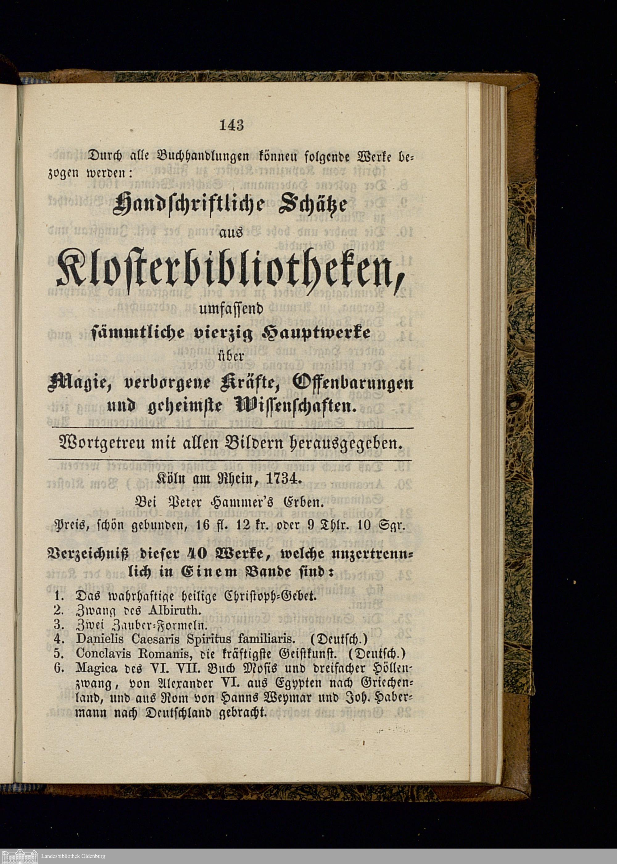 Nigromantisches Kunst-Buch, handelnd von der Glücks-Ruthe, dem Ring und der Krone Salomonis, den Fürsten-Geheimnissen, den dienstbaren Krystall- und Schatz-Geistern und andern wunderbaren Arcanen : Nach einer Handschrift aus der Bibliothek eines Fürst-Abtes im vorigen Jahrhundert wortgetreu und mit allen Abbildungen veröffentlicht : Der wahrhaftige englische Schlüssel Salomonis ... / Nach dem wahren Original verdeutscht und mit Abbildungen