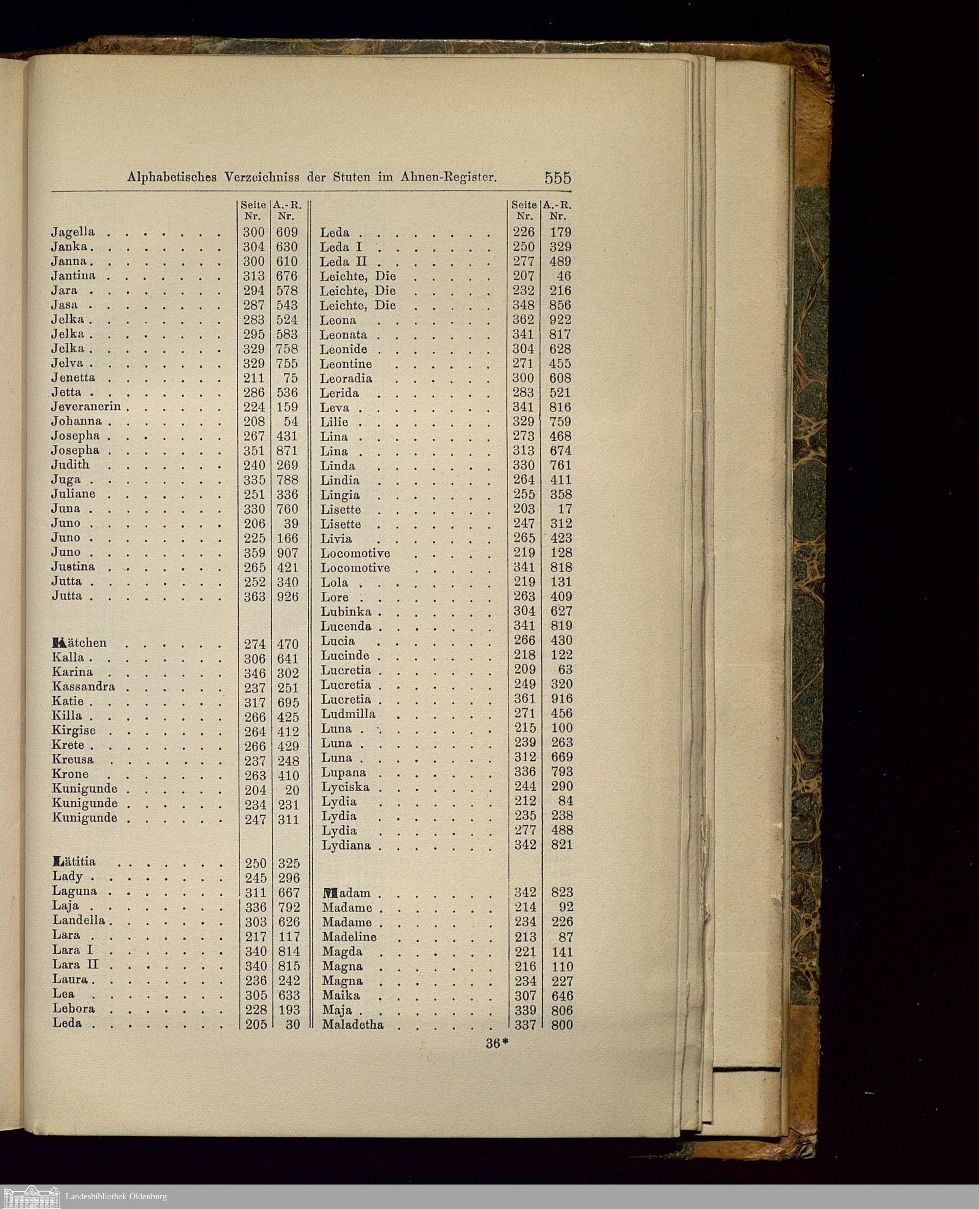 Alphabetisches Verzeichniss der Thiere.