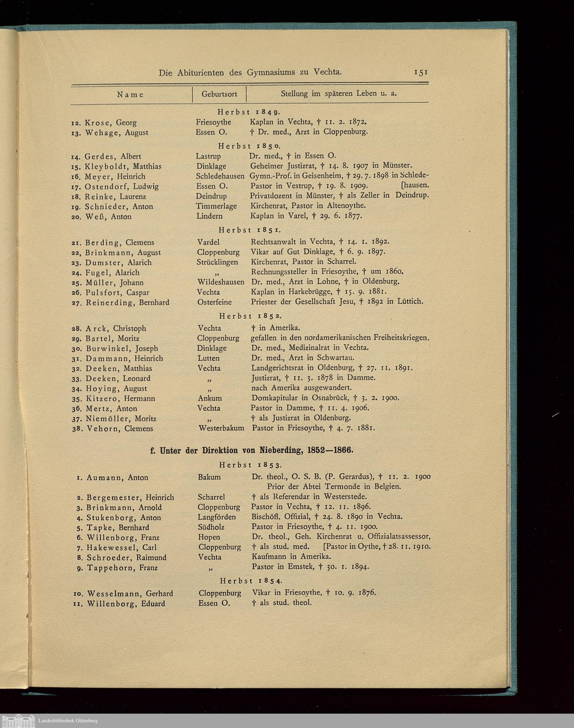 F. Lehrer und Abiturierenten des Gymnasiums zu Vechta. Von Prof. Dr. Pagenstert.