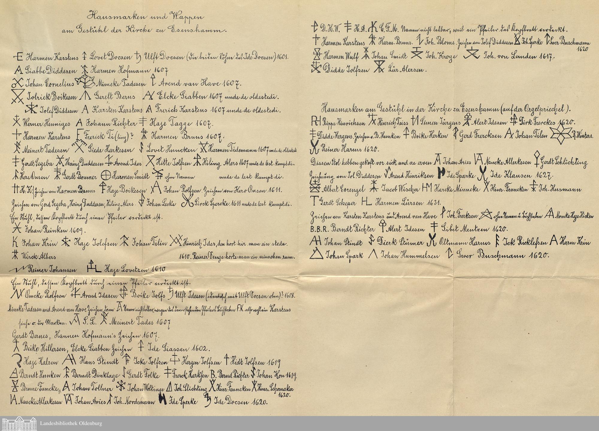 Hausmarken und Wappen am Gestühl der Kirche zu Esenshamm.