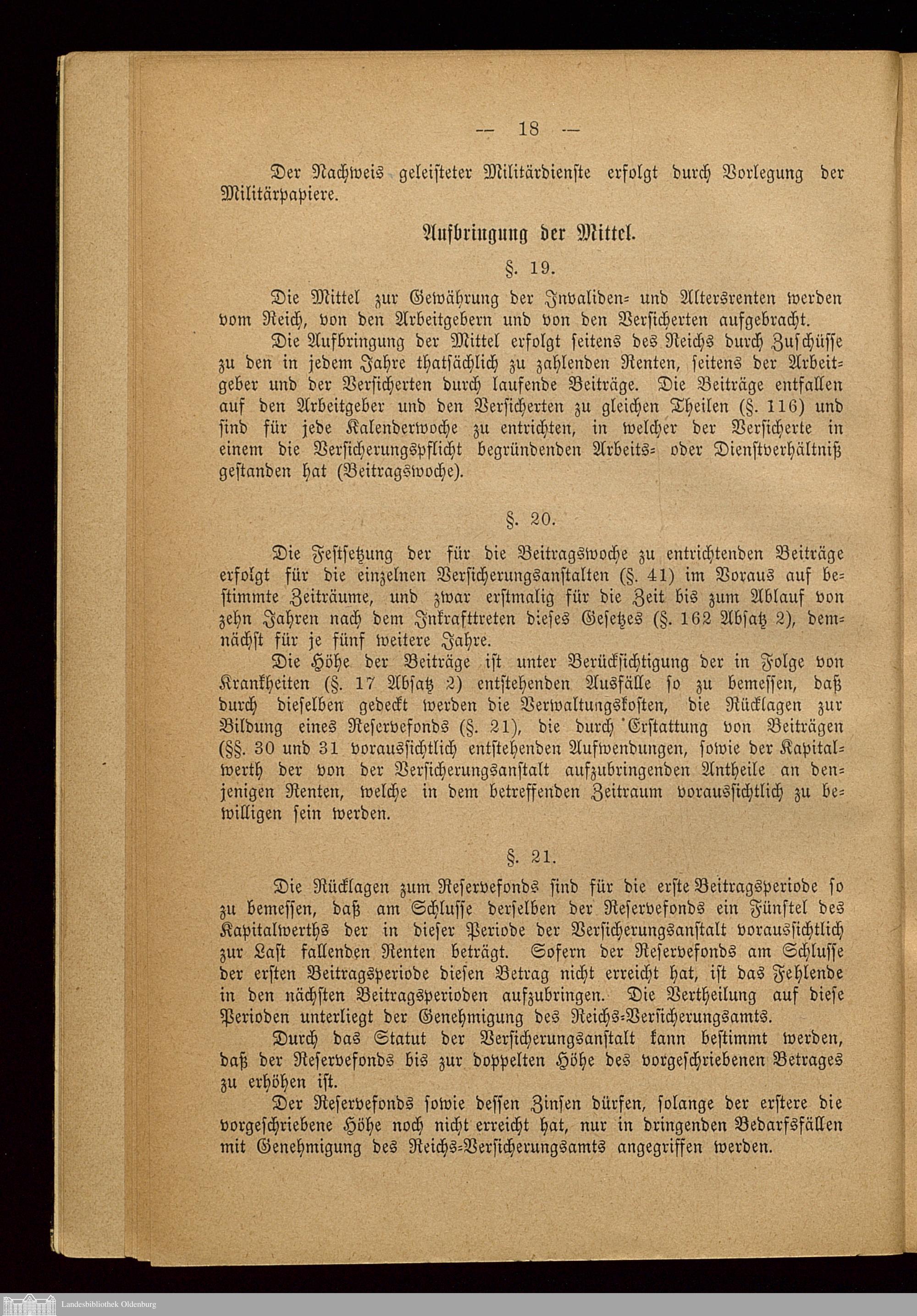 Statut der für das Herzogthum Oldenburg errichteten Versicherungsanstalt Oldenburg : nebst dem Gesetz vom 22. Juni 1889, betr. die Invaliditäts- und Altersversicherung, den zur Ausführung des Gesetzes erlassenen Ministerialbekanntmachungen vom 8. April und 30. Oktober 1890 und der Anleitung des Reichs-Versicherungsamts vom 31. Oktober 1890, betreffend den Kreis der nach dem Gesetz versicherten Personen