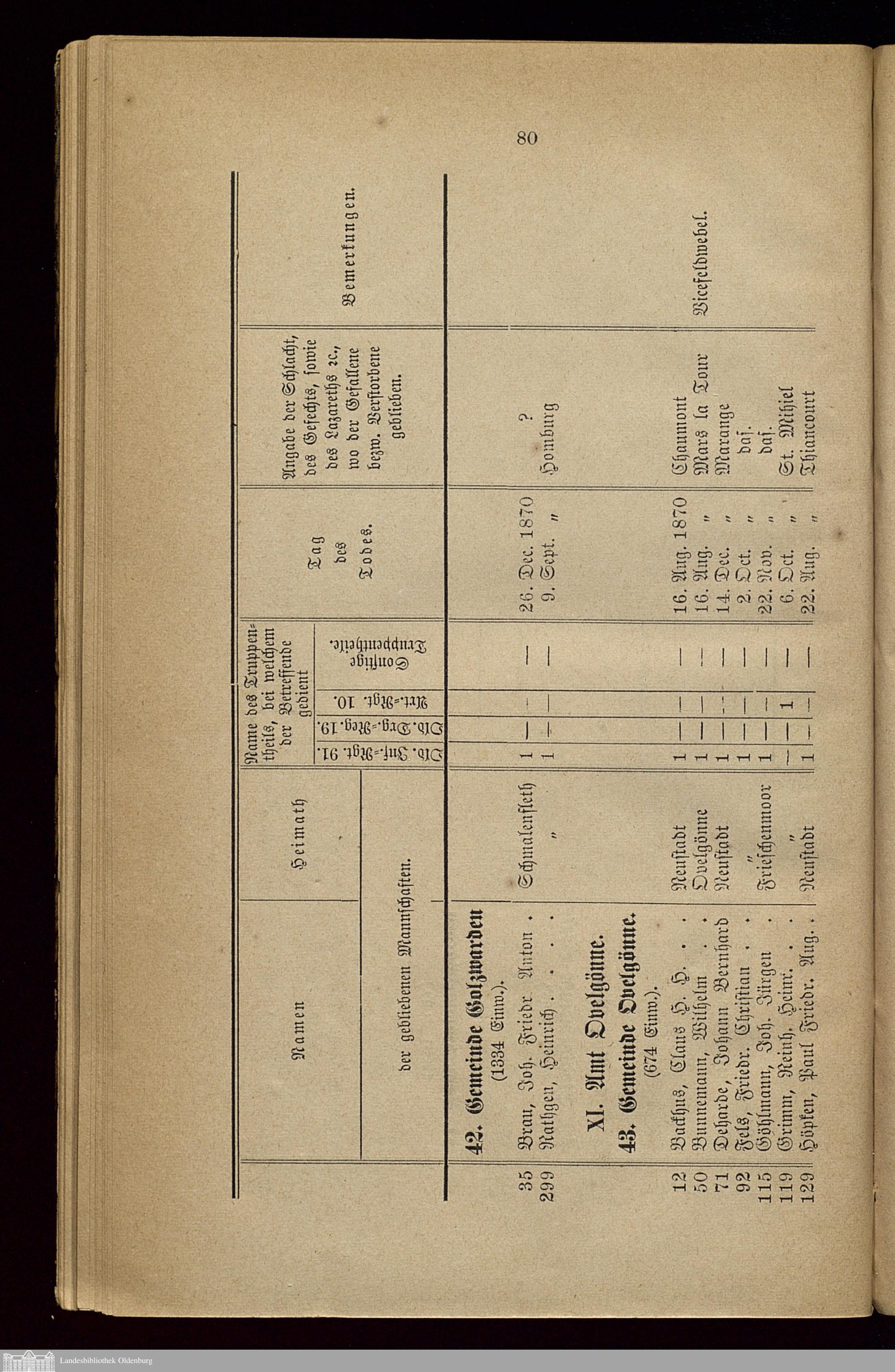Tabellarisch nach Gemeinden geordnete Zusammenstellung der im Kriege gegen Frankreich 1870/71 gefallenen, bzw. in Folge von Wunden und an Krankheiten gestorbenen Krieger aus dem Herzogthum Oldenburg