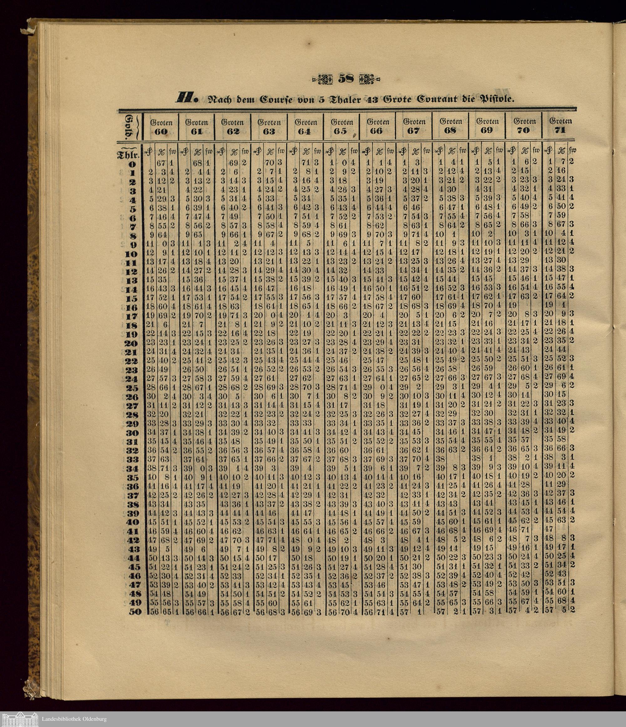 Reductions-Tabelle des Goldes in Courant : nach den muthmaßlich wechselnden Coursen der Pistole von 5 Thaler 36 Grote an bis zu 5 Thaler 48 Grote inclusive / berechnet von G. D. Klockgeter, Cammerrevisor in Oldenburg