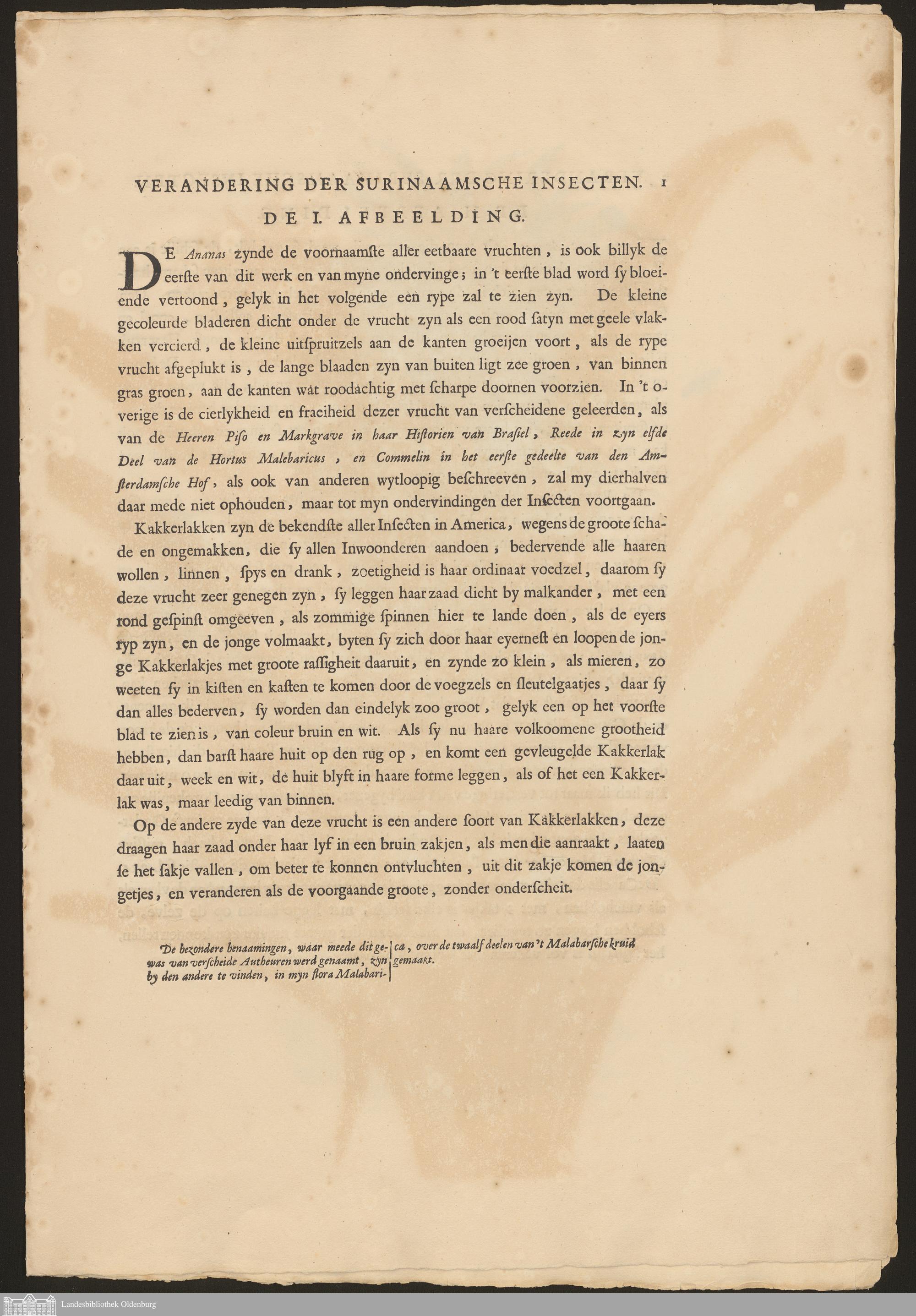 Metamorphosis Insectorum Surinamensium : Of Te Verandering Der Surinaamsche Insecten ; Waar in de Surinaamsche Rupsen en Wormen met alle des zelfs Veranderingen na het leven afgebeeld en beschreeven worden, zynde elk geplaast op die Gewassen, Bloemen en Vruchten, daar sy op gevonden zyn; waar in ook de generatie der Kikvorschen, wonderbaare Padden, Hagedissen, Slangen, Spinnen en Mieren werden vertoond en beschreeven, alles in America na het leven en levensgroote geschildert en beschreeven / Door Maria Sibylla Merian