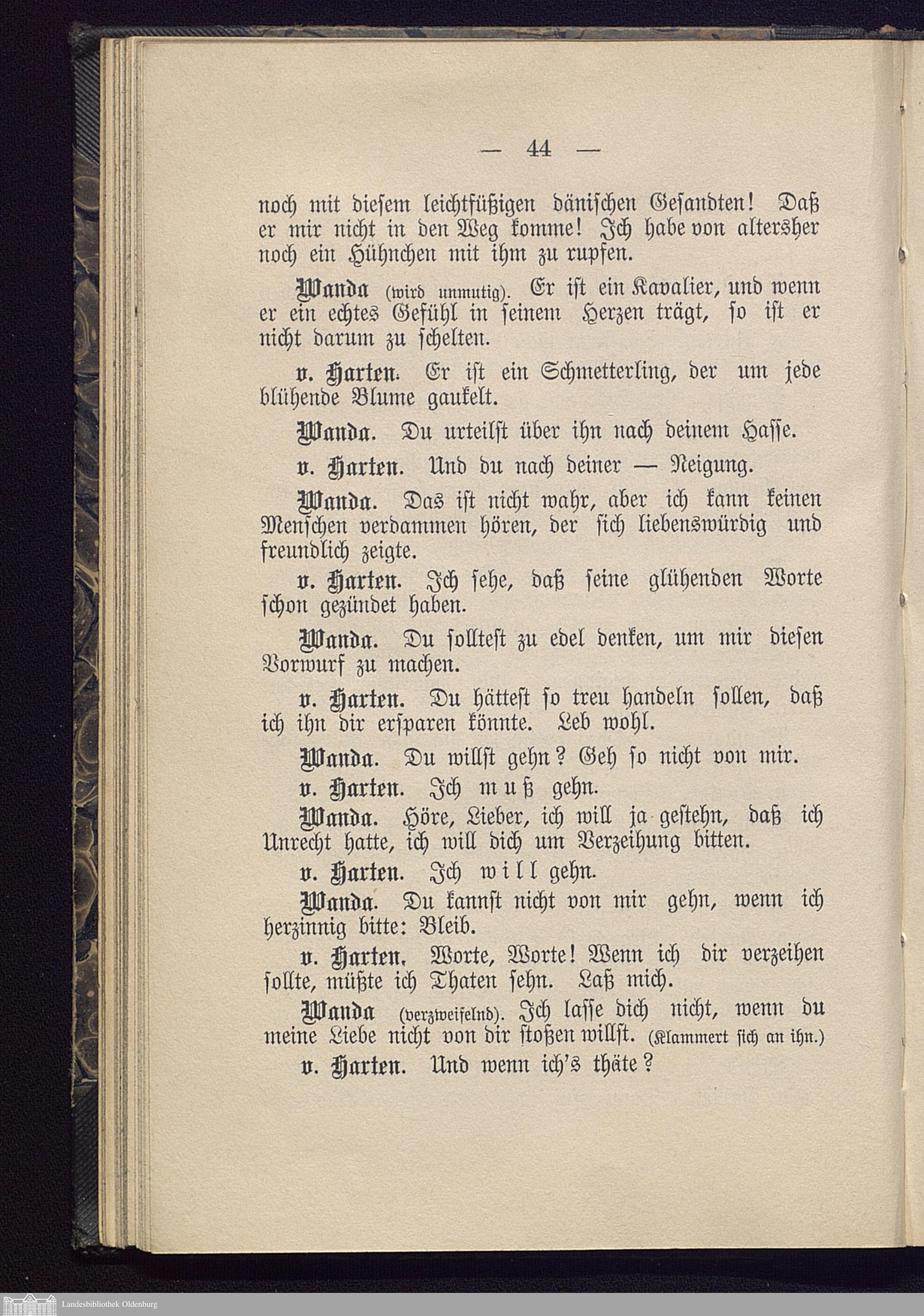 Sechster Auftritt. Wanda, vorsichtig durch die Mitte. Dann v. Harten.
