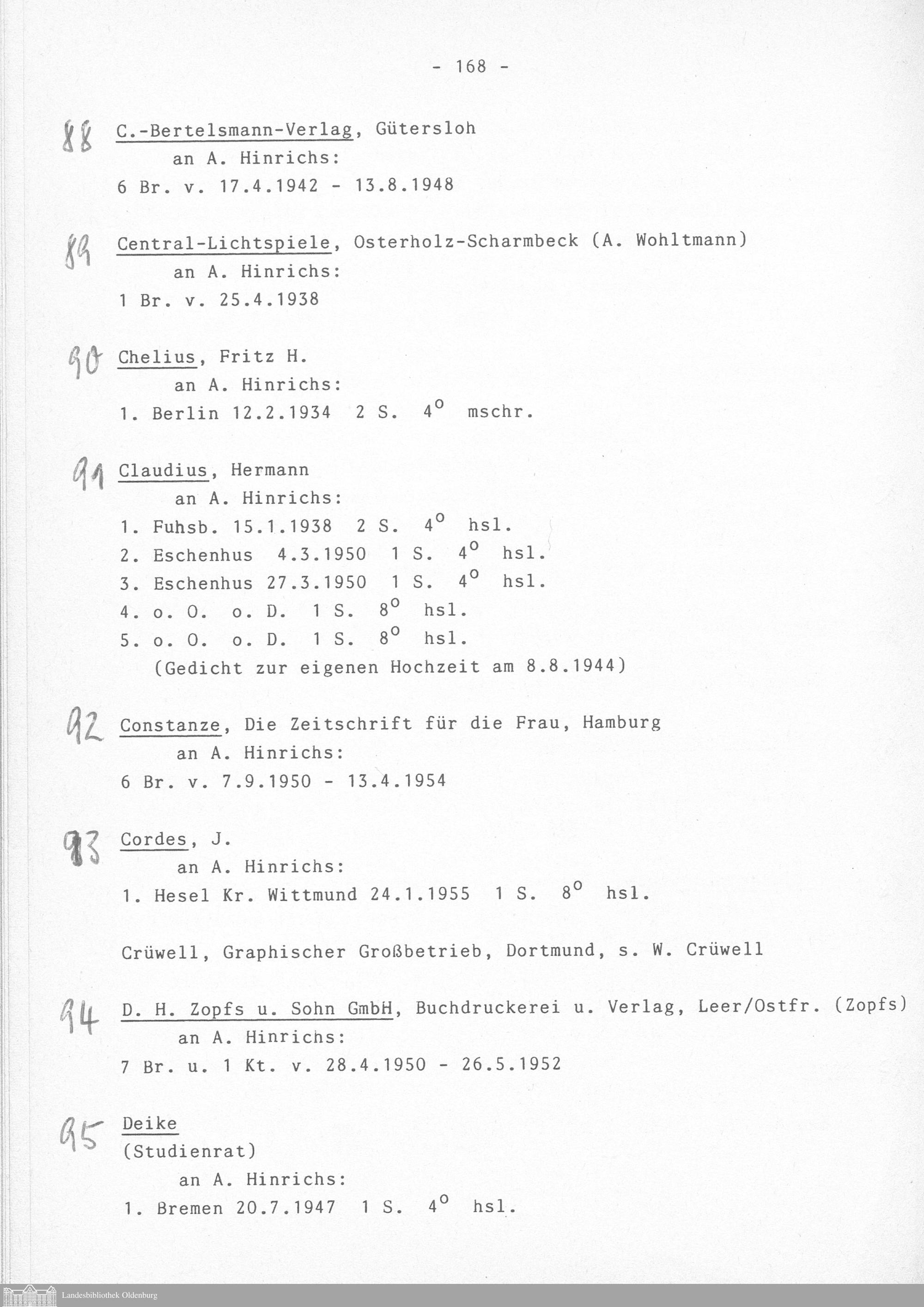 Der Nachlass August Hinrichs in der Landesbibliothek Oldenburg : Katalog / bearb. von Johann Onnen und Gerhard Preuß. Mit einem Beitr. von Karl Veit Riedel