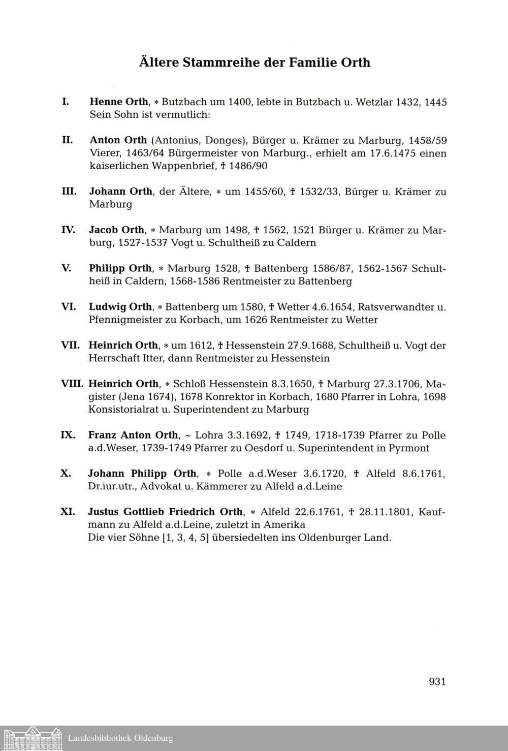 Die oldenburgischen Familienzweige Orth. Von Wolfgang Büsing
