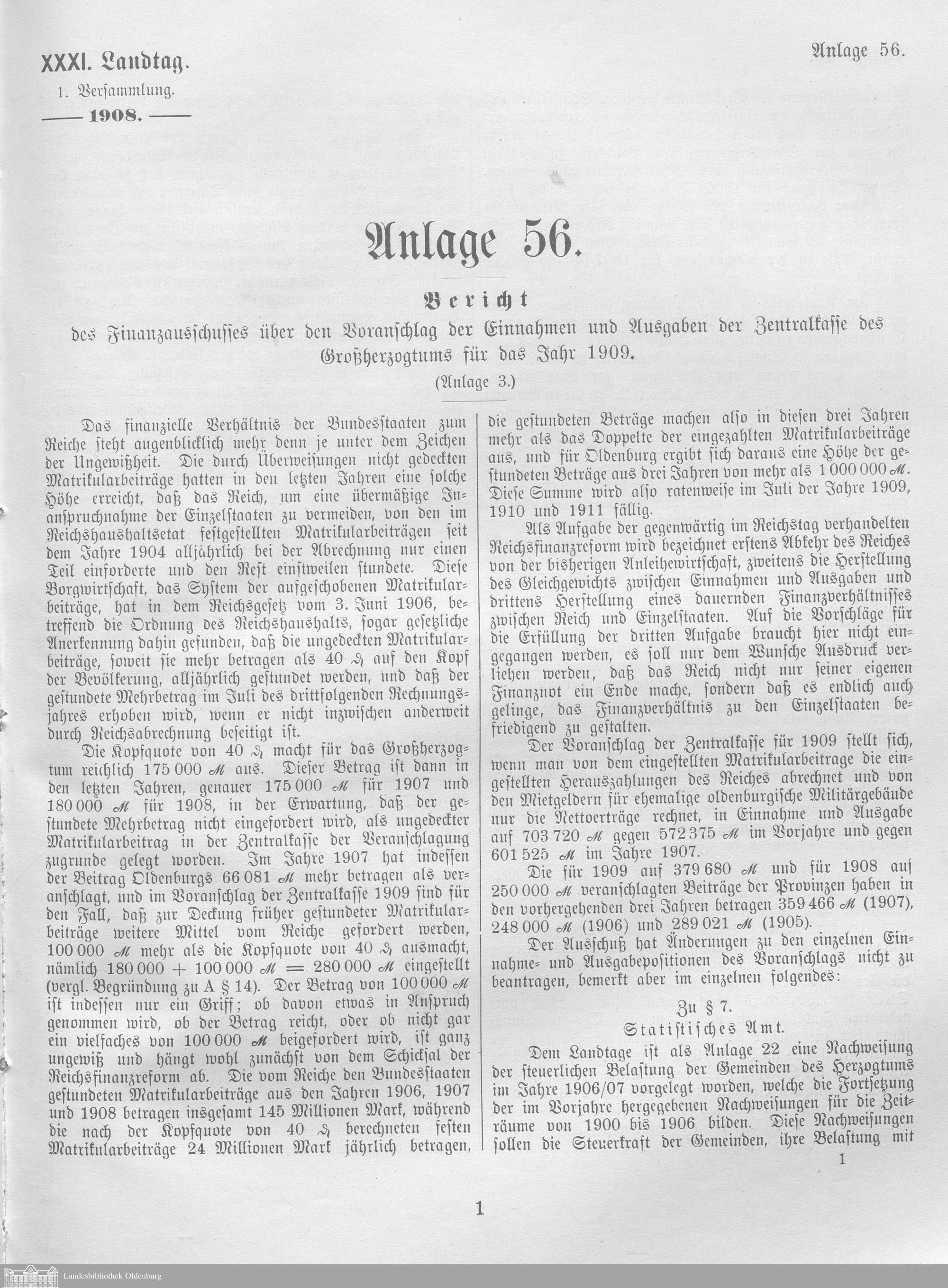 Verhandlungen der ... Versammlung des ... Landtags des Freistaats Oldenburg / Anlagen zu den Niederschriften und Berichten / Anlagen zu den Protokollen und Berichten