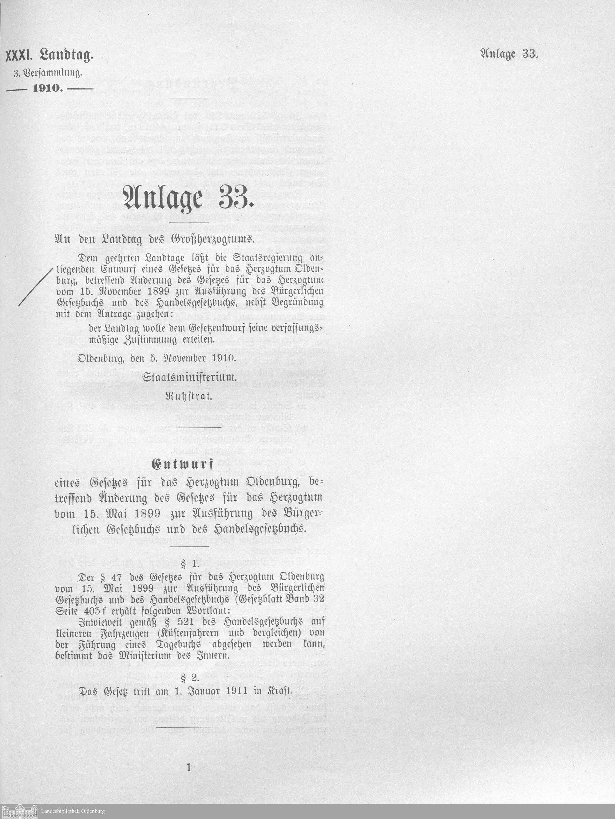 Verhandlungen der ... Versammlung des ... Landtags des Freistaats Oldenburg / Anlagen zu den Niederschriften und Berichten / Anlagen zu den Protokollen und Berichten