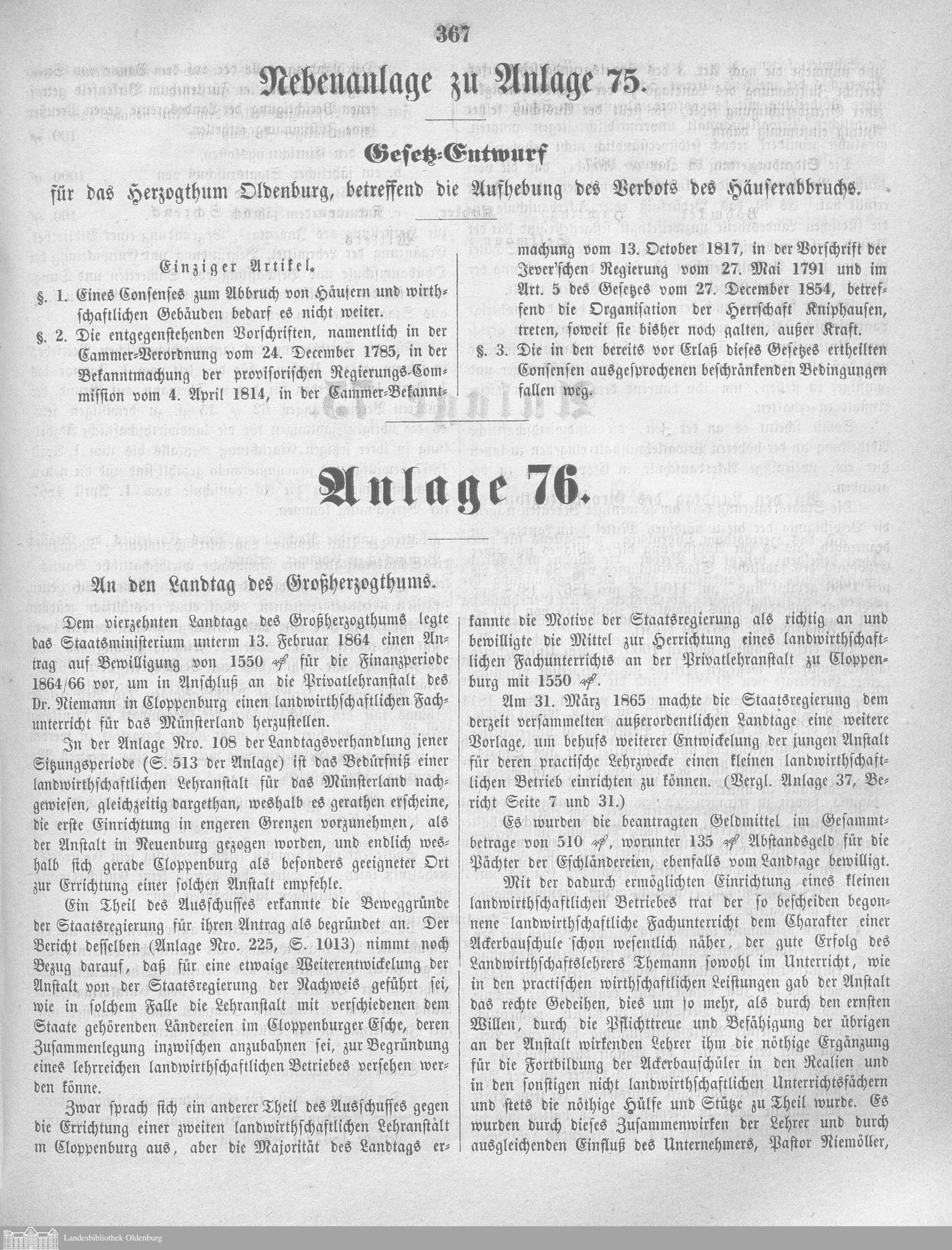 Verhandlungen der ... Versammlung des ... Landtags des Freistaats Oldenburg / Anlagen zu den Niederschriften und Berichten / Anlagen zu den Protokollen und Berichten