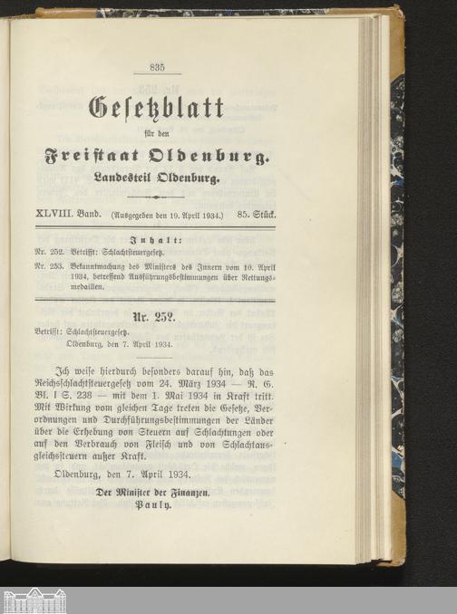 Gesetzblatt für den Freistaat Oldenburg, Landesteil Oldenburg