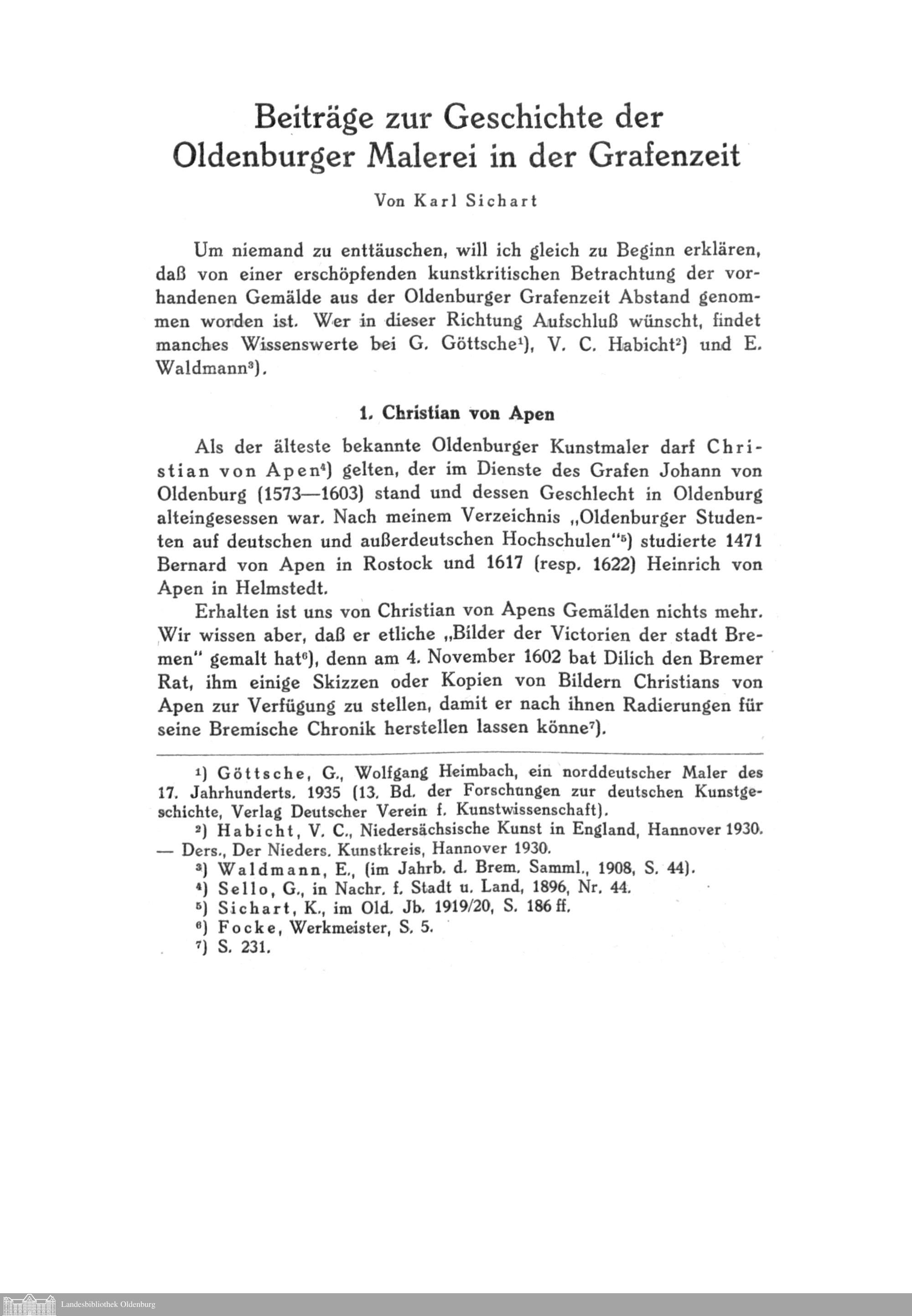 Beiträge zur Geschichte der Oldenburger Malerei in der Grafenzeit. Von Karl Sichart