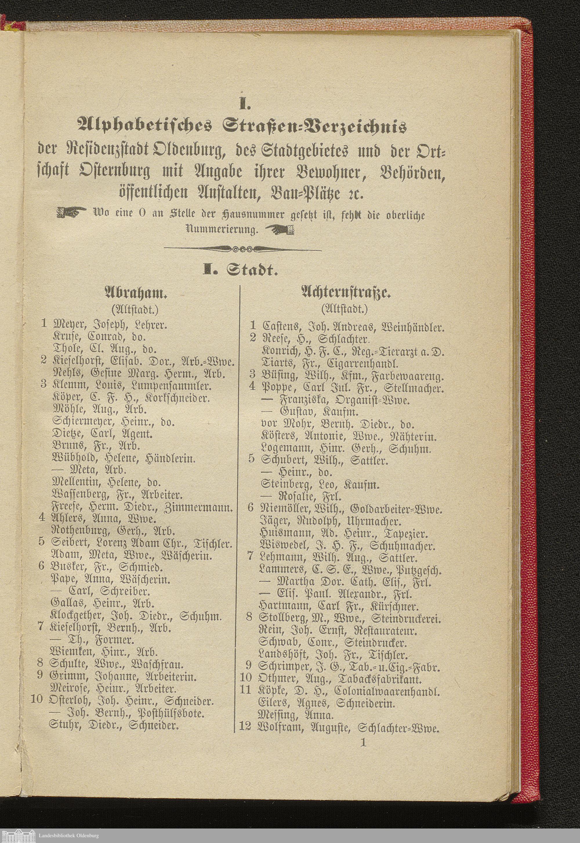 I. Alphabetisches Straßen-Verzeichnis der Residenzstadt Oldenburg, des Stadtgebietes und der Ortschaft Osternburg mit Angabe ihrer Bewohner, Behörden, öffentlichen Anstalten, Bau-Plätze etc.