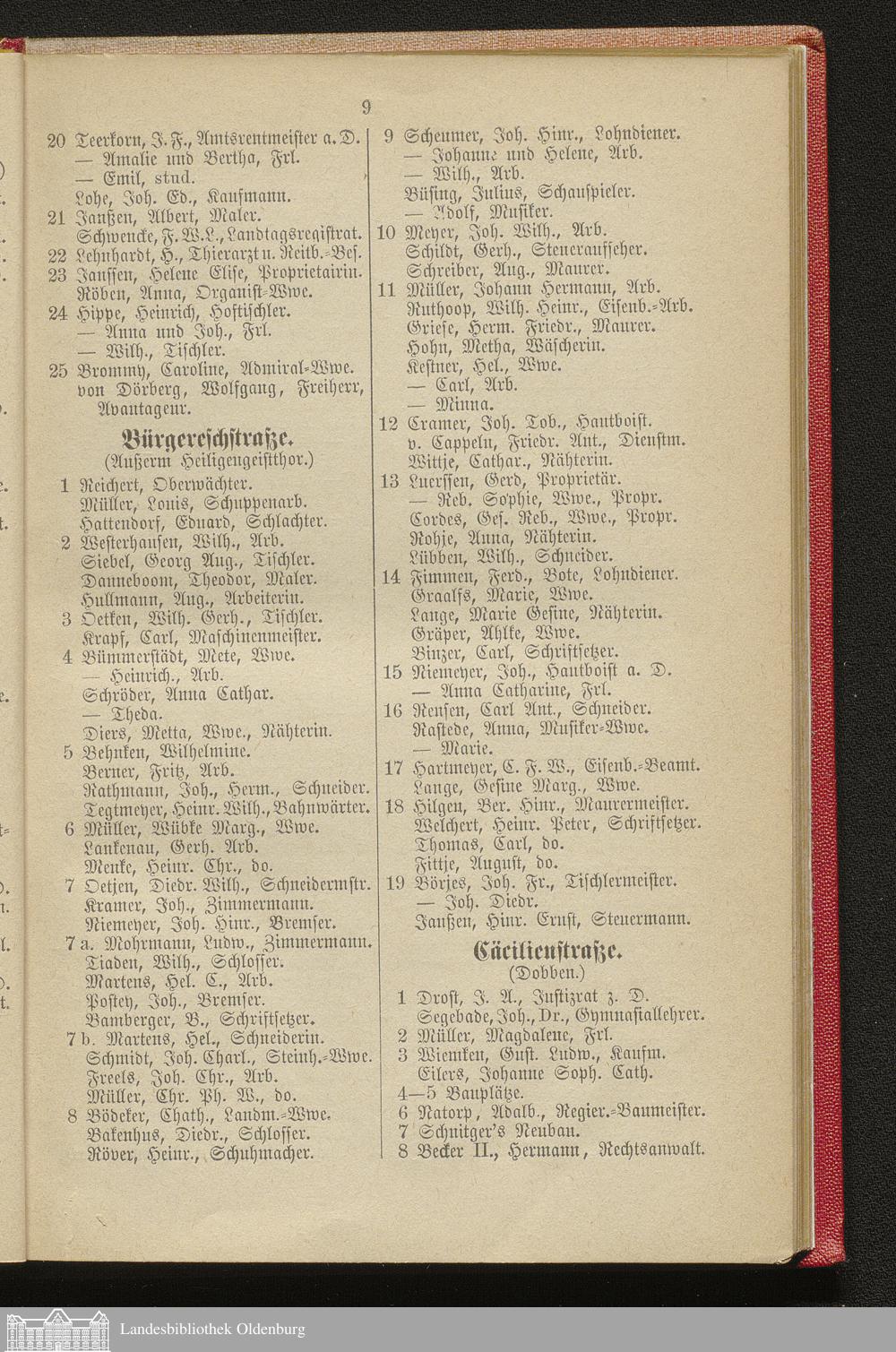 I. Alphabetisches Straßen-Verzeichnis der Residenzstadt Oldenburg, des Stadtgebietes und der Ortschaft Osternburg mit Angabe ihrer Bewohner, Behörden, öffentlichen Anstalten, Bau-Plätze etc.