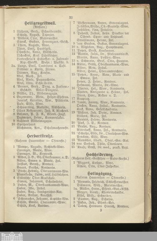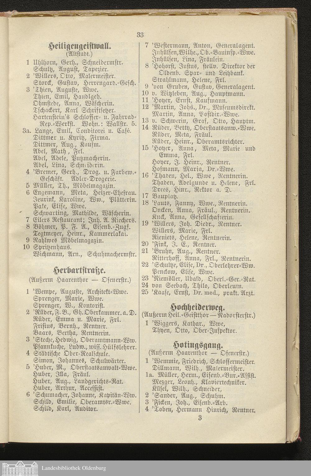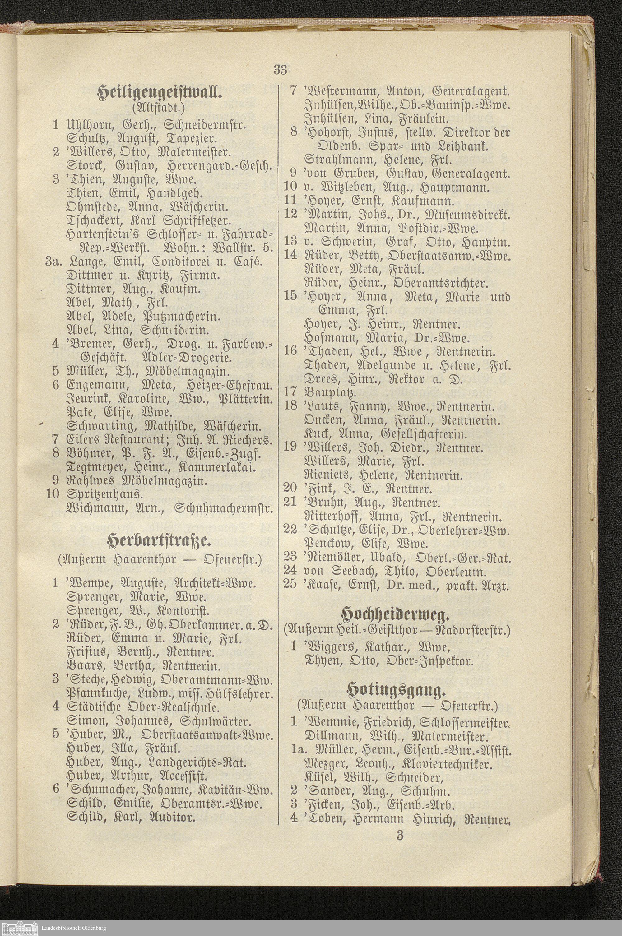 I. Alphabetisches Straßen-Verzeichnis der Residenzstadt Oldenburg, des Stadtgebietes Oldenburg, der Ortschaft Osternburg und eines Teils der Gemeinden Eversten und Ohmstede mit Angabe ihrer Bewohner, Behörden, öffentlichen Anstalten etc.