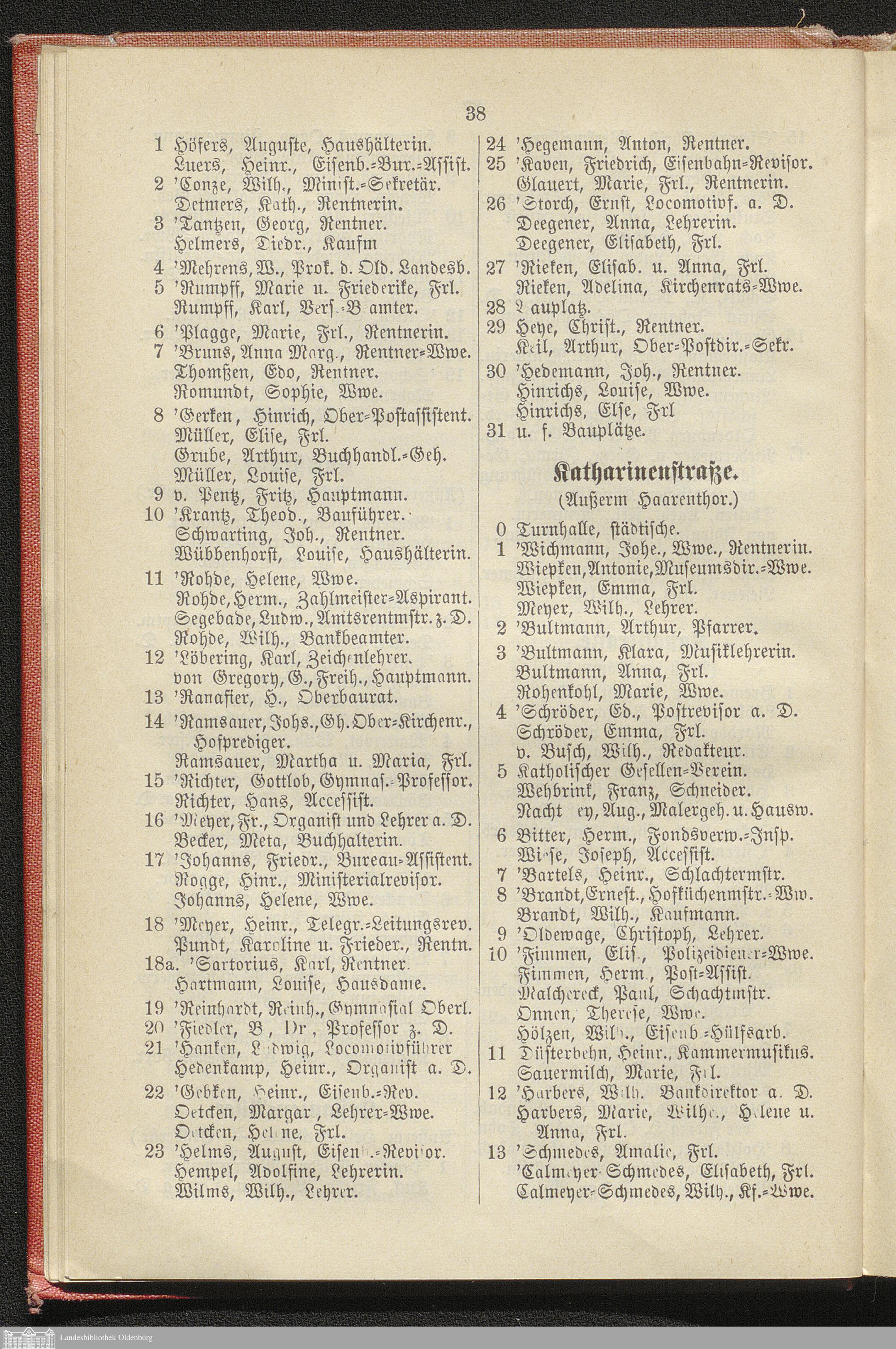 I. Alphabetisches Straßen-Verzeichnis der Residenzstadt Oldenburg, des Stadtgebietes Oldenburg, der Ortschaft Osternburg und eines Teils der Gemeinden Eversten und Ohmstede mit Angabe ihrer Bewohner, Behörden, öffentlichen Anstalten etc.